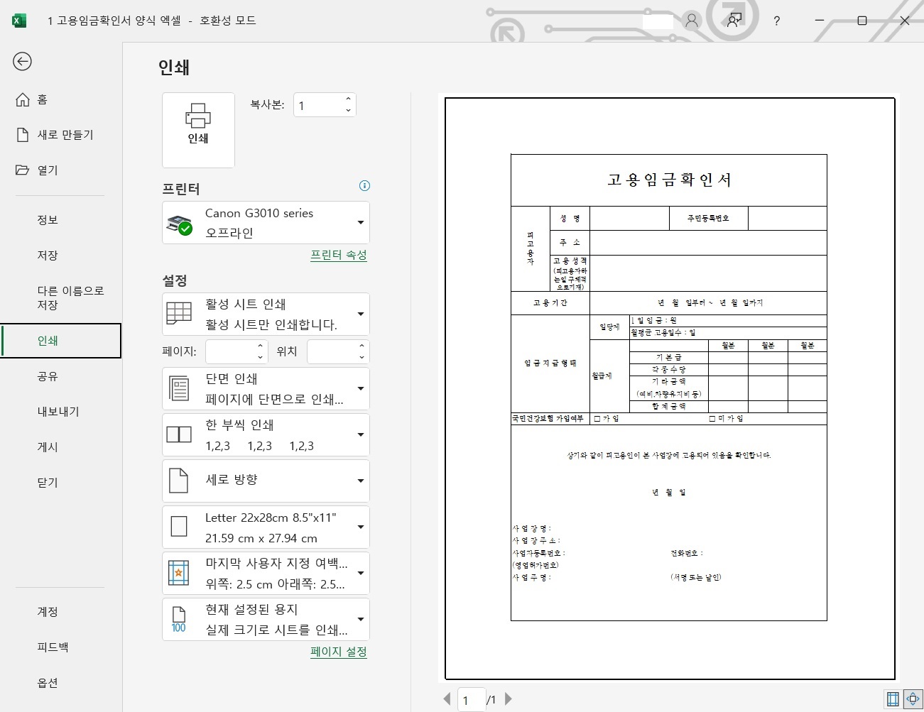 한글 파일로써 프린트하기 전에 미리보기 했을 때의 모습입니다.