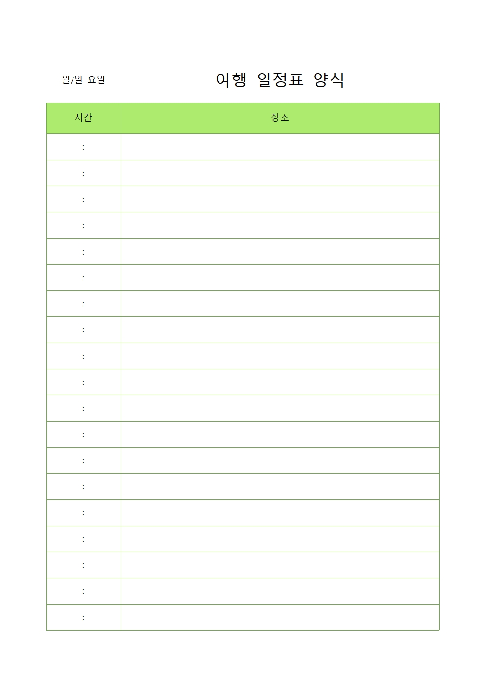 끝으로 아주 심플하게 사용할 수 있는 일일 여행일정표 양식입니다. 직관적이고 간단한 일정표를 찾으신다면 위의 첨부된 파일을 저장하시면 됩니다. 첫 번째 첨부파일은 한글, 두 번째가 엑셀, 세 번째가 워드 파일입니다. 여행을 떠나기 전 나만의 계획표를 잘 세워서 안전하고 즐거운 여행 잘 다녀오시길 기원합니다.