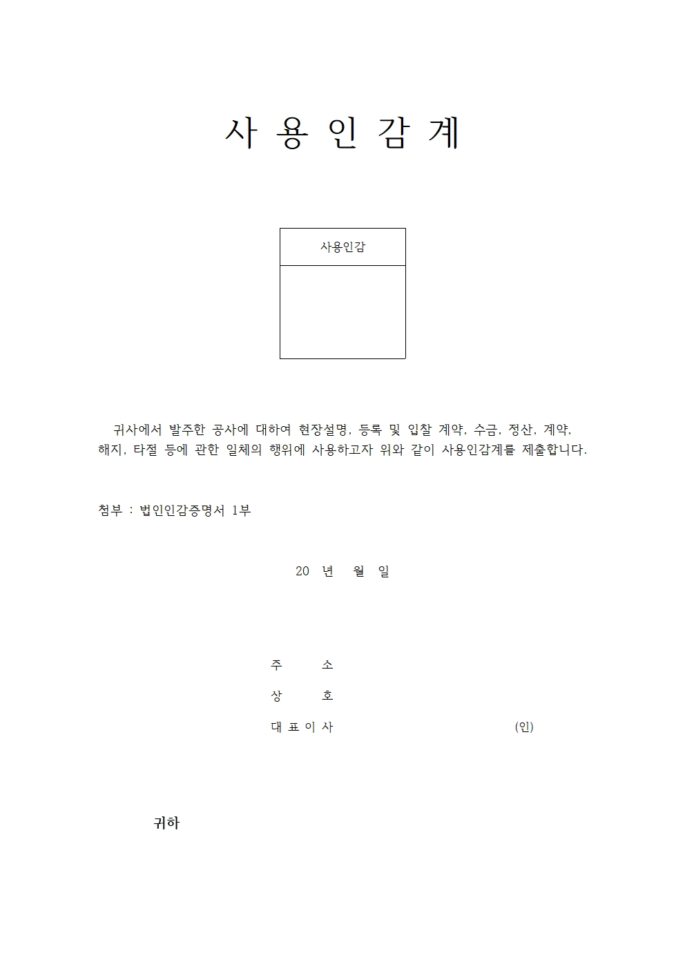 마지막은 사용인감 부분만 한 칸으로 구성된 서식입니다. '귀 사에서 발주한 공사에 대하여 현장설명, 등록 및 입찰 계약, 수금, 정산, 계약, 해지, 타절 등에 관한 일체의 행위에 사용하고자 위와 같이 사용인감계를 제출합니다'라는 문구가 쓰여 있습니다. 하단에는 주소, 상호, 대표이사 성함 싸인란만 기재할 수 있는 심플한 서식입니다.