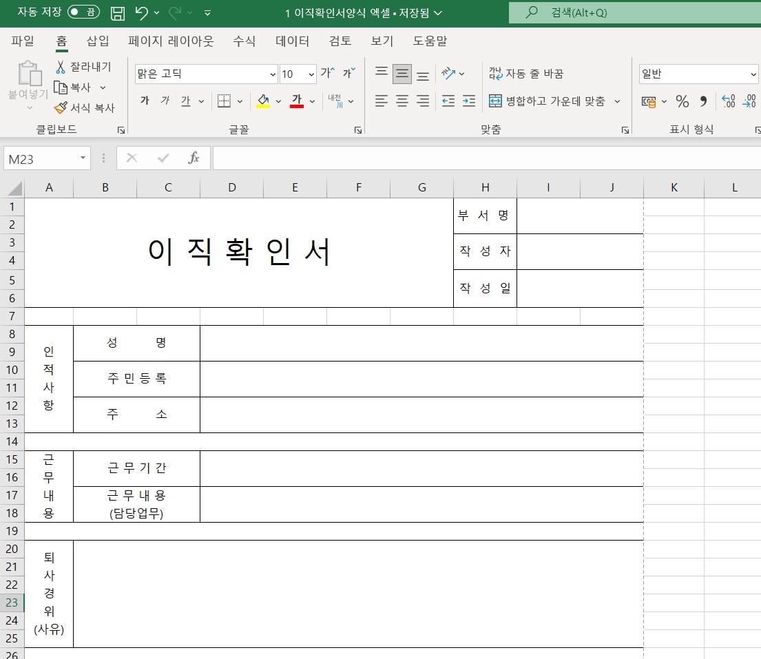 먼저 엑셀 파일의 이직확인서 양식입니다. 부서명과 작성자, 작성일 등이 상단에 위치해 있으며, 성명과 주민등록 번호, 주소를 입력하는 인적사항 란, 근무기간과 담당업무를 입력하는 근무내용 란, 퇴사 경위와 사유를 입력하는 란 순으로 구성된 서식입니다.