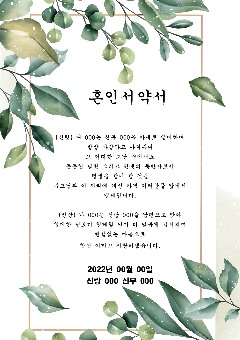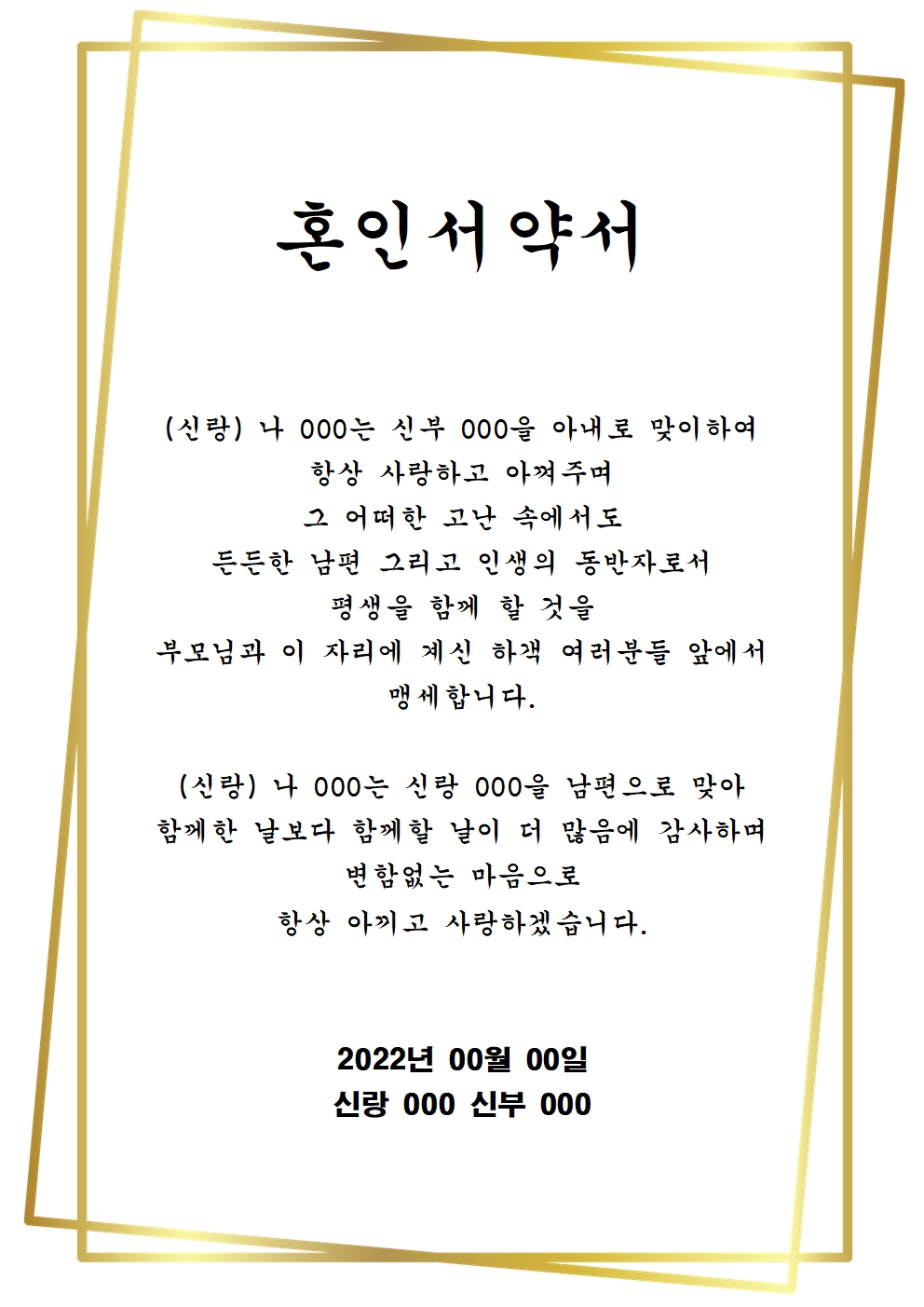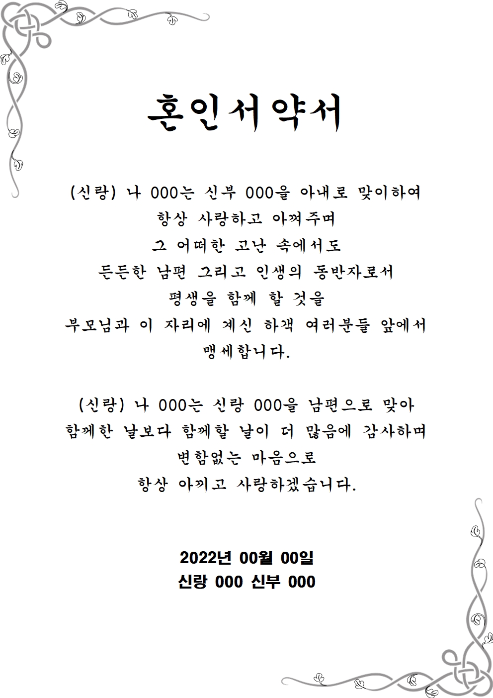 혼인서약서 같은 경우에는 기존에 온라인상에서 가장 트래픽이 많은 예시 문구들을 총 다섯 가지로 엄선하여 선정하였으며, 과하지 않는 무난한 느낌의 성혼선언문이기 때문에 여느 결혼식에서도 무난하게 활용 가능합니다.