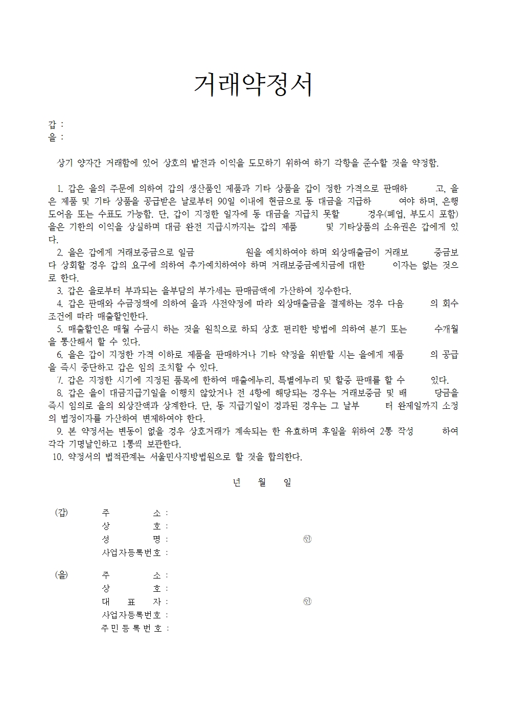 가장 활용도가 많은 순으로 1번부터 7번까지 후원 약정서와 임대료 인하, 거래약정서, 대여금 약정서, 공동사업 및 투자약정서까지 총 7종의 서식이며 기타 신용보증, 가격, 거래계좌이체, 거래추가, 건설 공사나 기부금, 계약인수, 착한임대인, 상가건물 임대료, 채무 등 다양한 상황에 활용될 수 있을 것 같습니다.