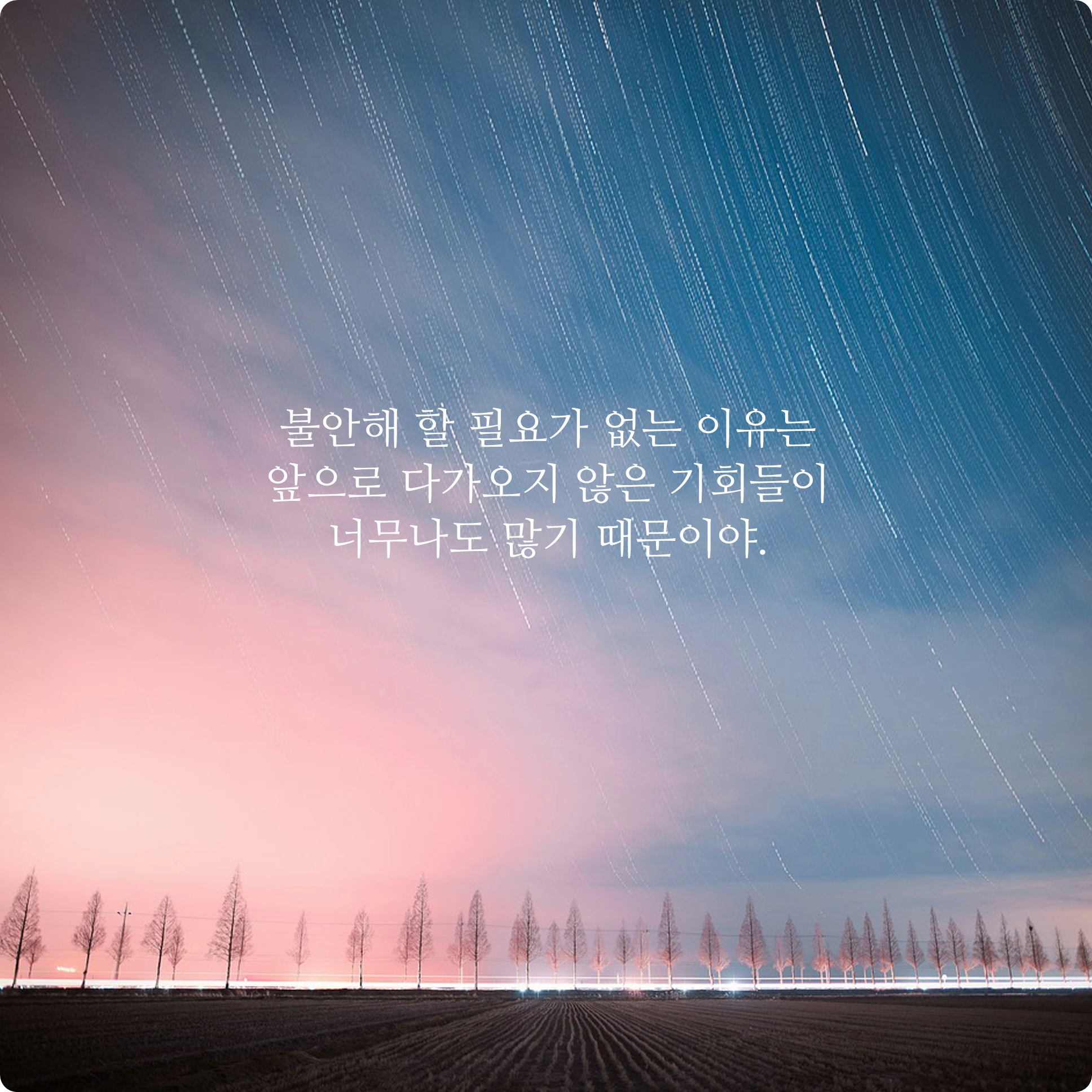 전혀 불안해하거나 걱정할 필요 없어요. 지금껏 얼마나 많은 인생을 살았나요? 지금부터 아니 앞으로의 훗날에도 더 많은 기회들이 계속해서 다가올 것이랍니다. 그러니 너무 걱정해하거나 불안할 필요는 없어요.