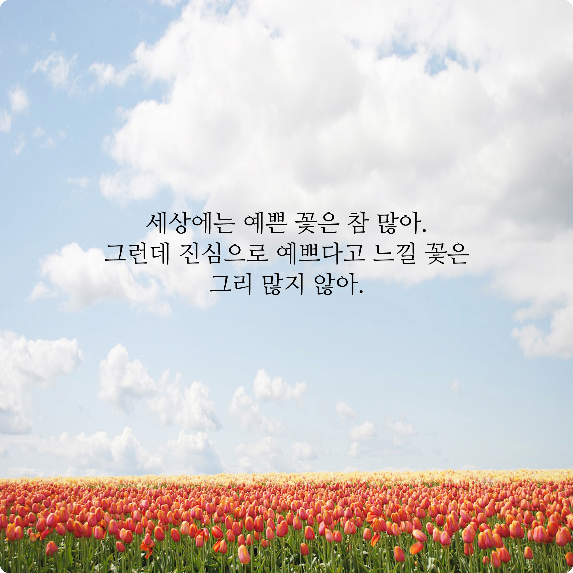 세상에는 참 예쁘고 아름다운 꽃이 많은데요. 하지만 그 수많은 꽃 중에서 정작 내가 진심을 담아 예쁘다고 느끼는 꽃은 많지가 않죠. 어쩌면 단 하나가 될 수도 있고 평생동안 단 하나도 느낄 수 없을지도 몰라요. 예쁘다고 느끼는 개수가 아니라 그 예쁜 꽃에 대해서 진실되게 느끼는 나의 마음이 더 중요한 것 같습니다.