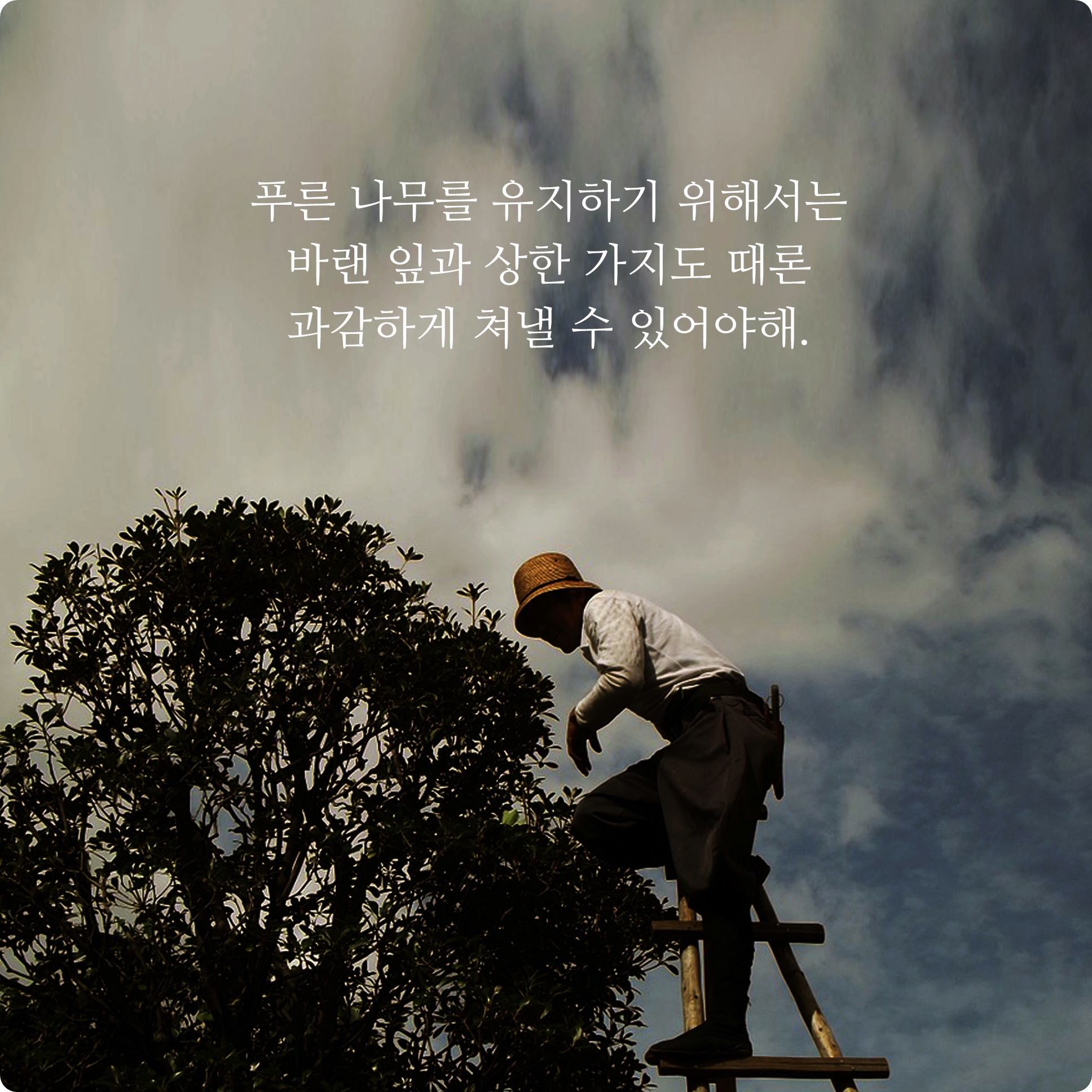 겉으로 봤을땐 예쁘고 고귀한 나무가 있다고 하더라고 그 나무는 어떤이의 과감한 결단력에 의해 그 아름다움의 자체를 자아내는 것인지도 몰라요. 더욱 더 아름답고 푸르른 나무를 위해서 때로는 결단력있고 과감할 줄도 알아야 하며 더 좋은 것들을 받아들이기 위해서는 불필요한 요소들을 과감하게 버릴 줄 아는 그런 자세도 필요한 것 같습니다.