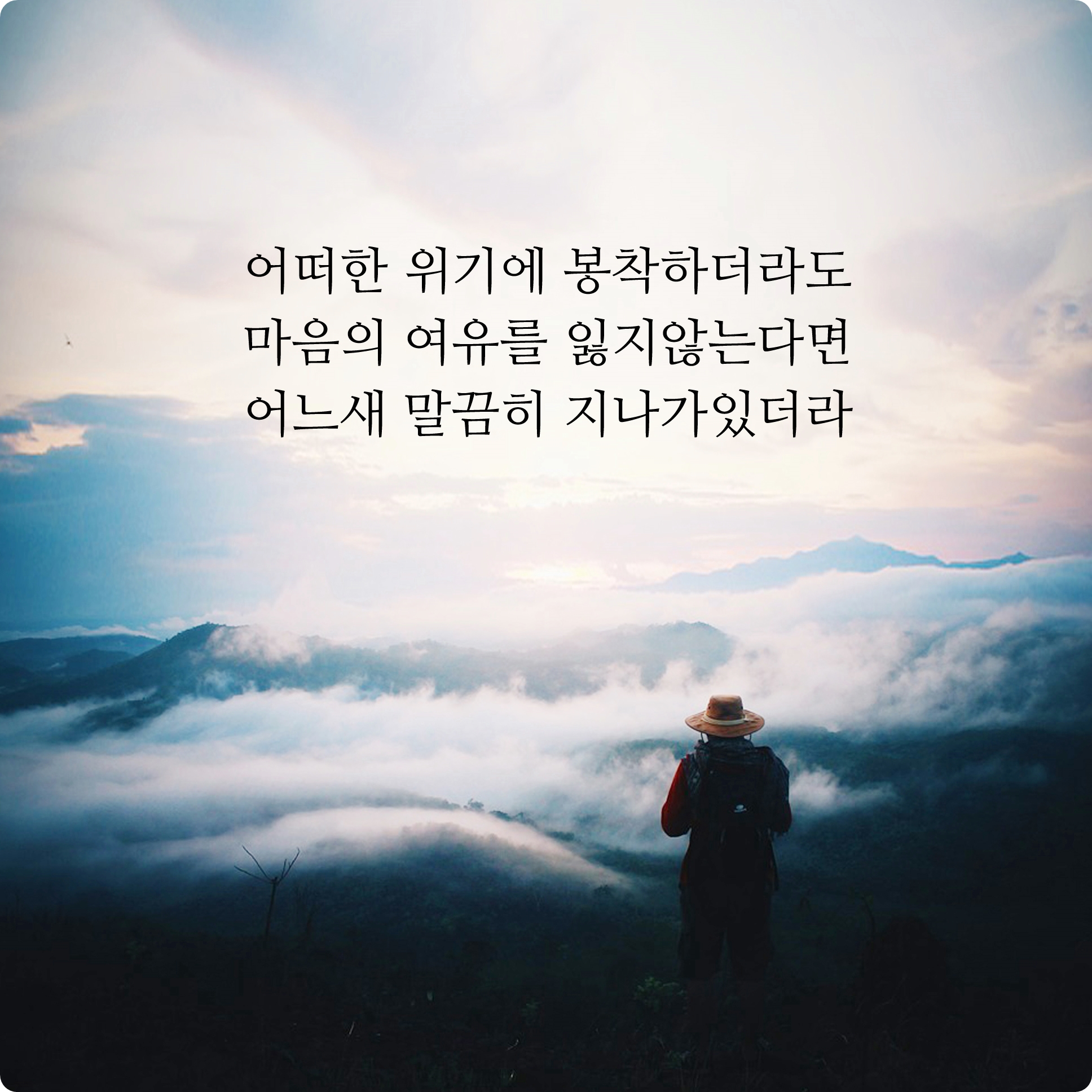 위기상황에 처해 있어도 그런 상황들에 늘 마음의 여유만 간직해 있다면 시간이 지나면 그런 위기나 시련들도 자연스럽게 다 흘러가 있죠. 무엇이던 순리에 따라서 자연스럽게 흘러가곤 합니다. 내가 그 시련들을 다 느끼기도 전에 말이죠.