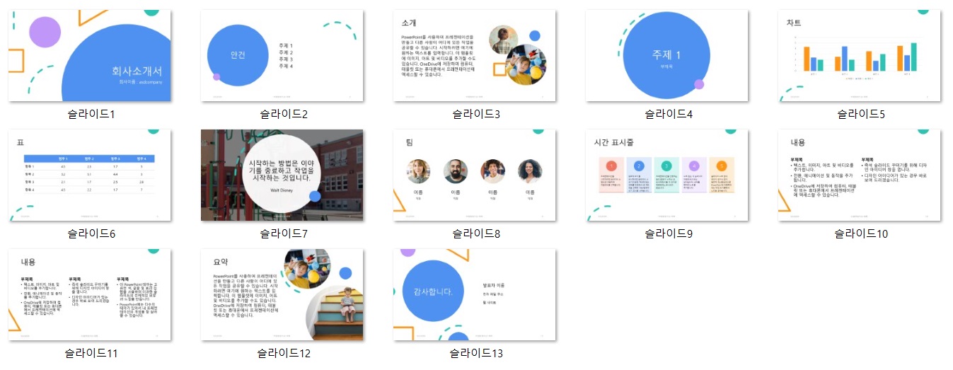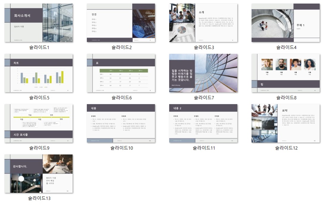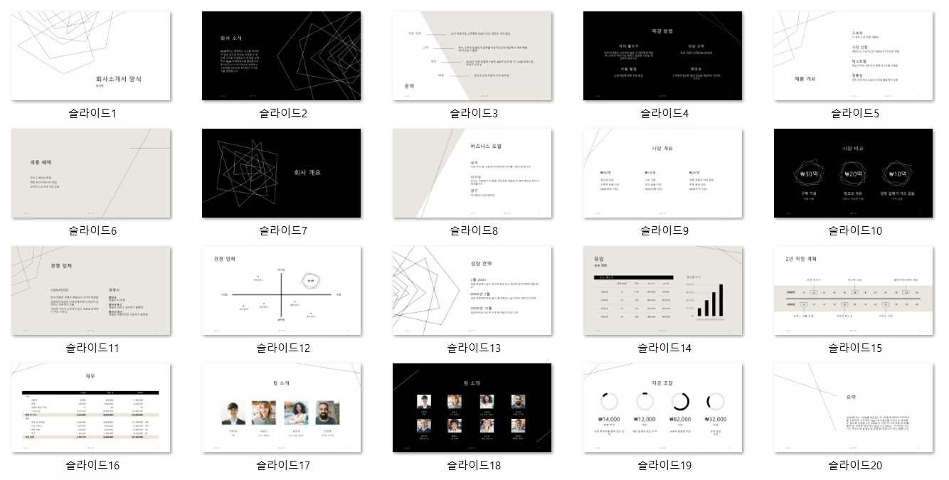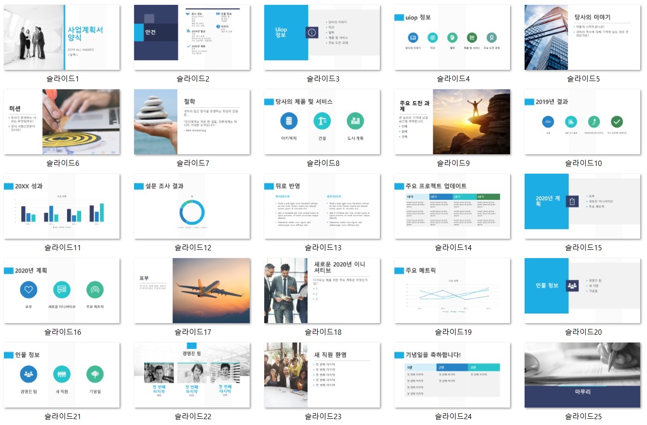 전반적으로 간단하게 작성하기 좋은 서식에서부터 고급스러운 디자인도 있으며 파일 하나당 표지, 목차, 인사말이나 조직도, 구성원 등이 들어가 있어 원하시는 구성만 골라서 제작하시는 것도 도움이 될 것 같습니다.