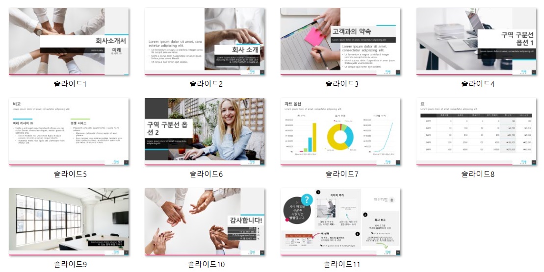 다음은 고객과의 약속, 비교, 차트 옵션과 표, 이미지(사진) 페이지로 구성된 파일입니다. 이렇게 비즈니스 관련 사진 위주로만 제작된 구성도 깔끔하네요.