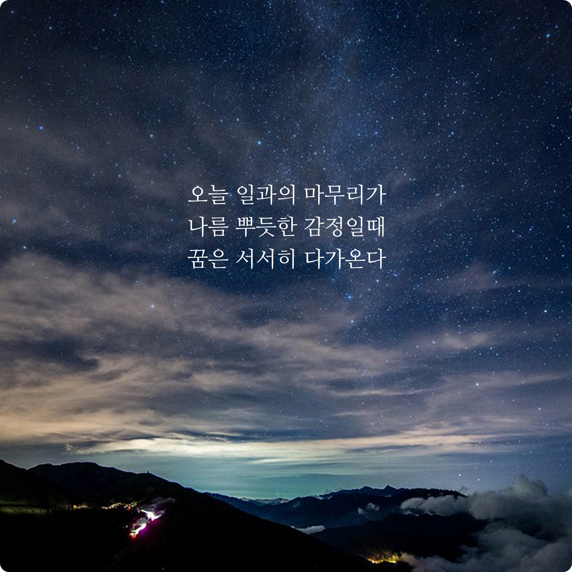 잠들기 전 이제 숨을 고르고 잠을 청했을때 오늘 하루의 일과가 뿌듯하다고 느꼈을대 그런 일과, 그런 감정이 반복하는 날일수록 하루하루 지난다면 꿈과의 거리 또한 점점 더 가까워질 것이랍니다.