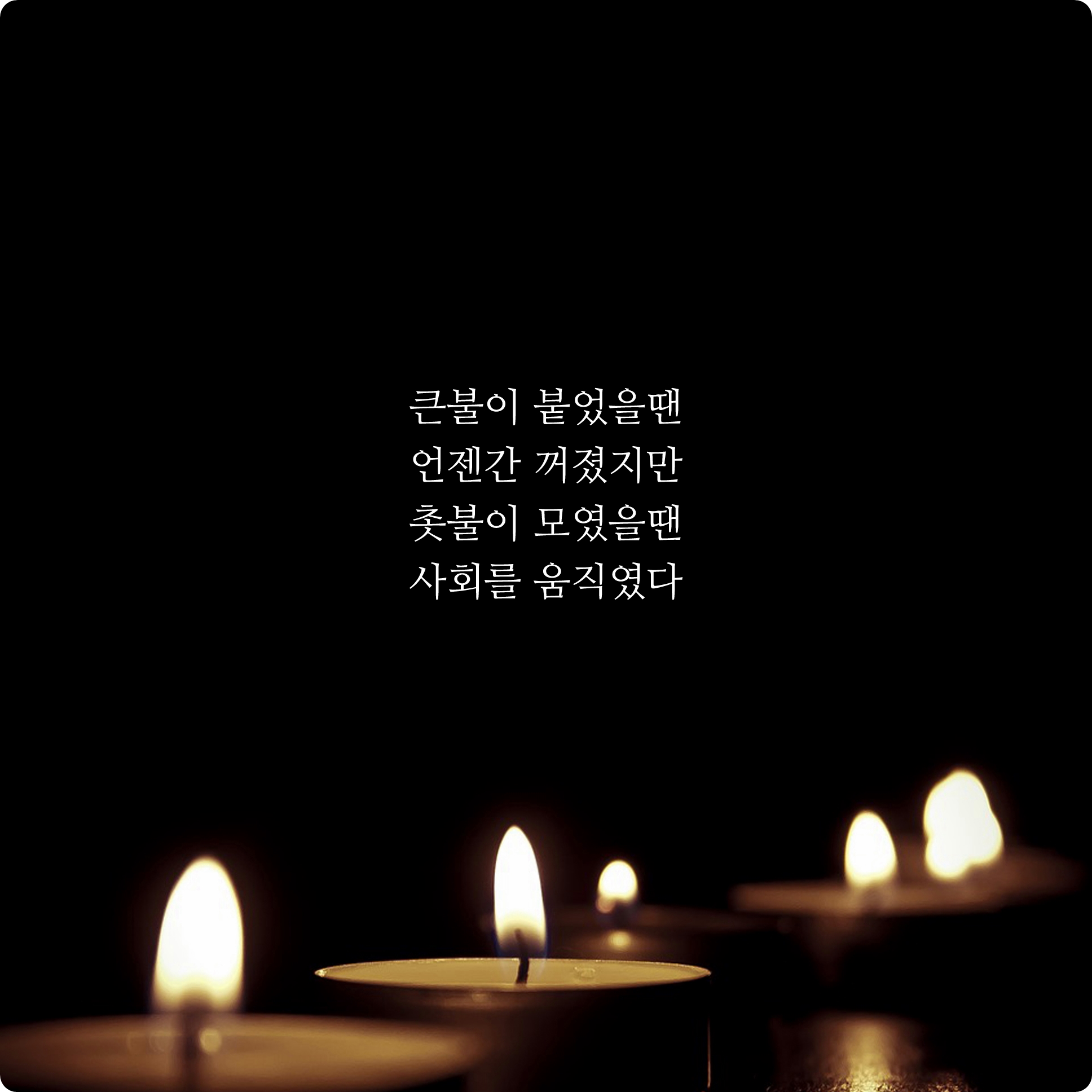 불의 화력이 아무리 크고 세더라도 작은 촛불들이 모였을때의 위력보다 강하지는 않아요. 촛불 집회처럼 작은 빛들도 모이면 좀 더 나은 사회로 변화되기도 하죠. 그런 뜻과 신념, 희망의 상징이 바로 촛불이죠.