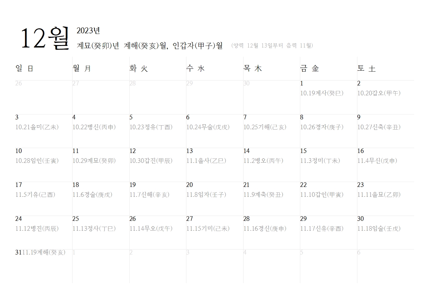 먼저 2023년 12간지 달력을 다운로드를 한 후 열었을 때 화면입니다. 상단에는 당해 해당되는 연도와 월을 확인할 수 있도록 한자로 표기했습니다. 일반적인 달력처럼 일요일 월요일, 화요일, 수요일, 목요일, 금요일 토요일 순으로 기재되어 있으며 각각 양력이 제일 위에 굵은 글씨로 그 뒤에 음력 날짜와 12간지, 한자 순으로 입력이 되어있습니다.