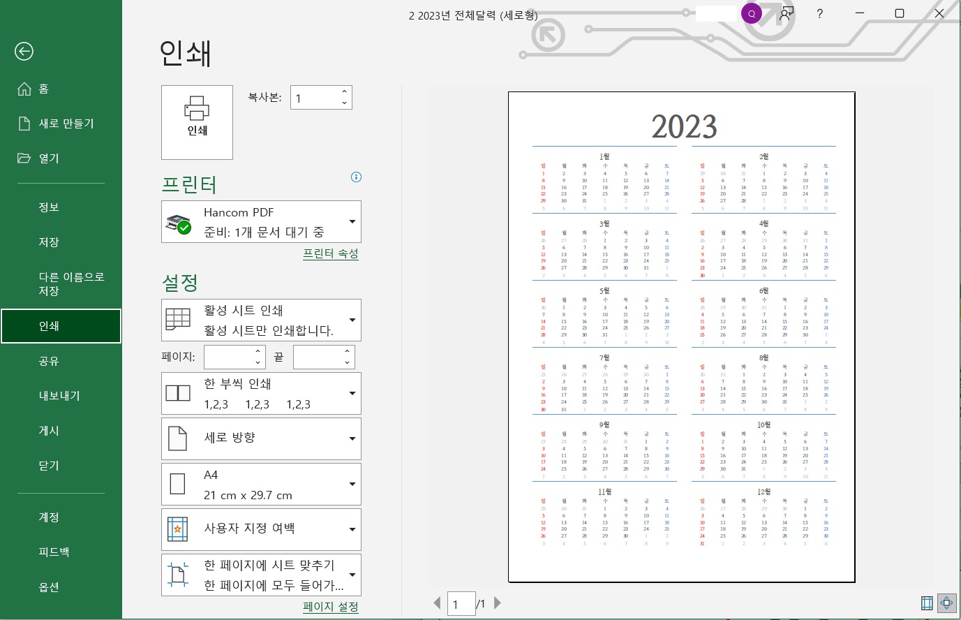 미리보기 했을 때에는 요일 선택 부분과 설명 셀 영역이 제외되어 연도부터 깔끔한 화면으로 출력됩니다.