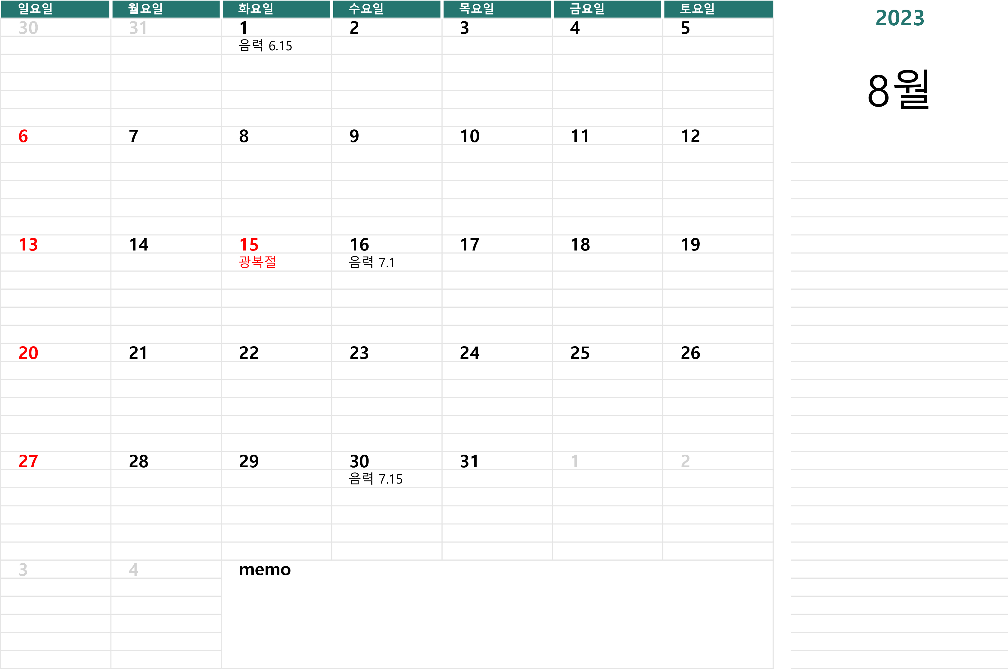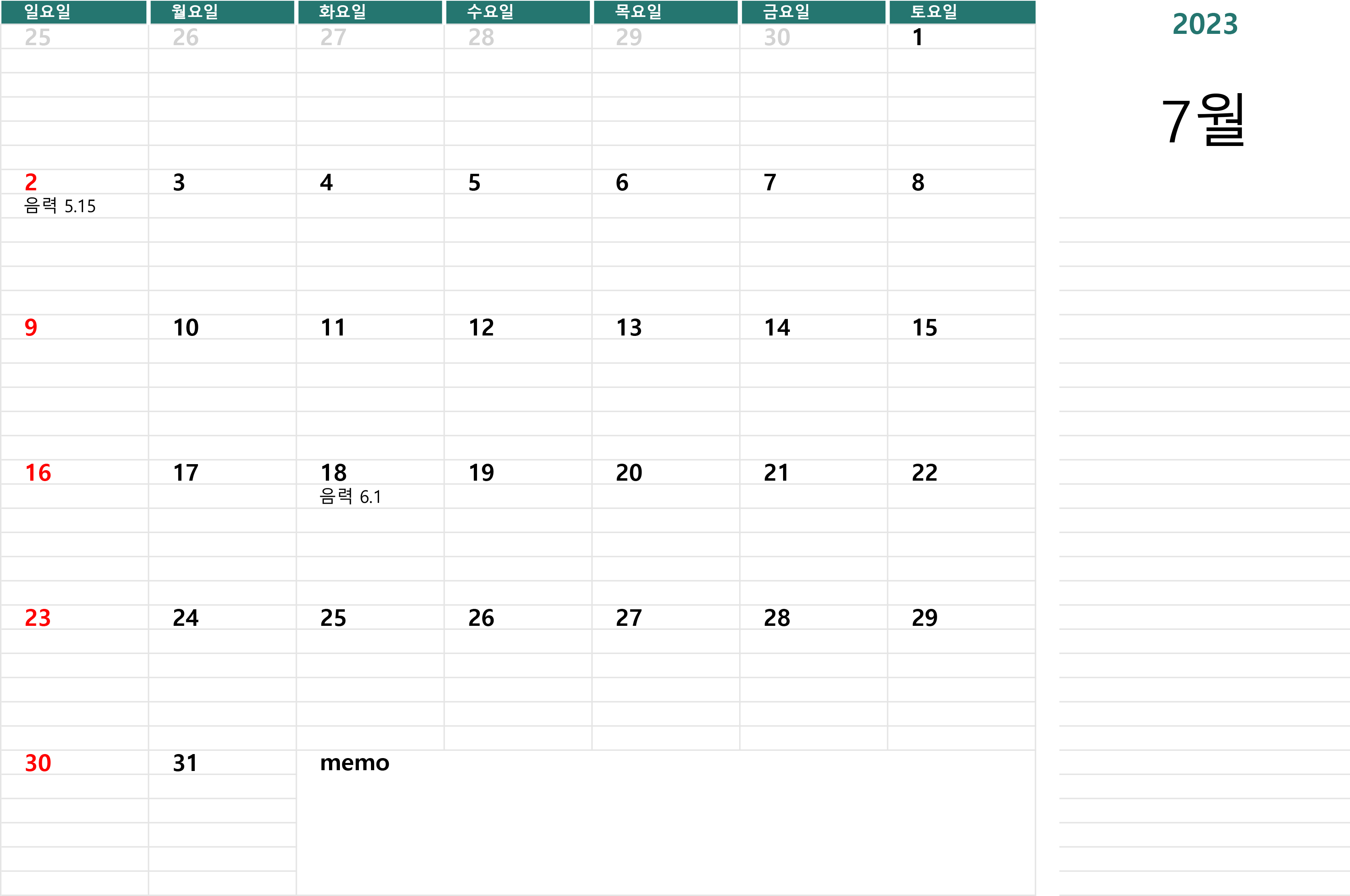 기존에 많은 분들이 다운로드를 해주셨던 달력 서식에 메모란을 추가한 2023년 월별 달력 엑셀 파일을 업로드를 했습니다.
