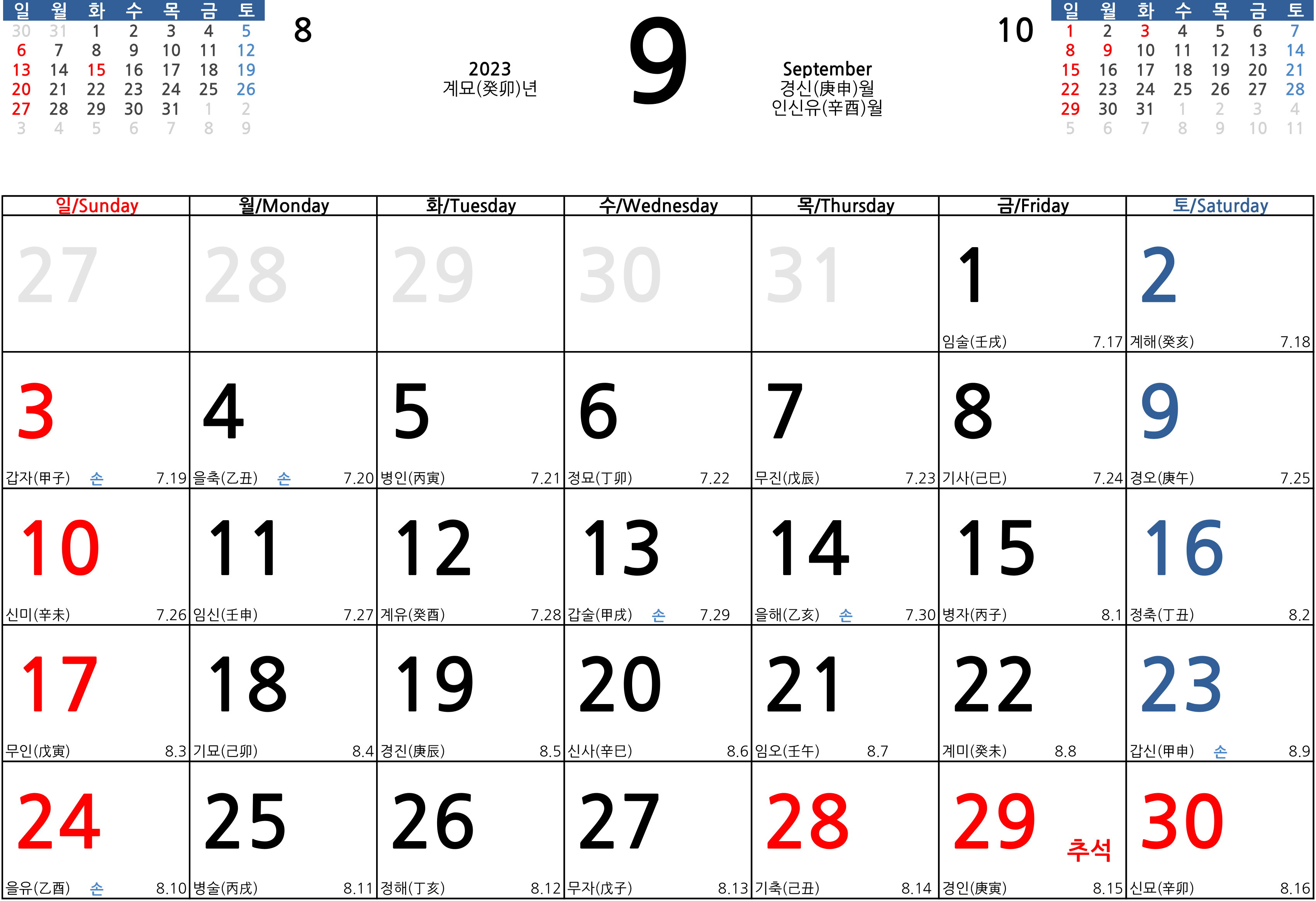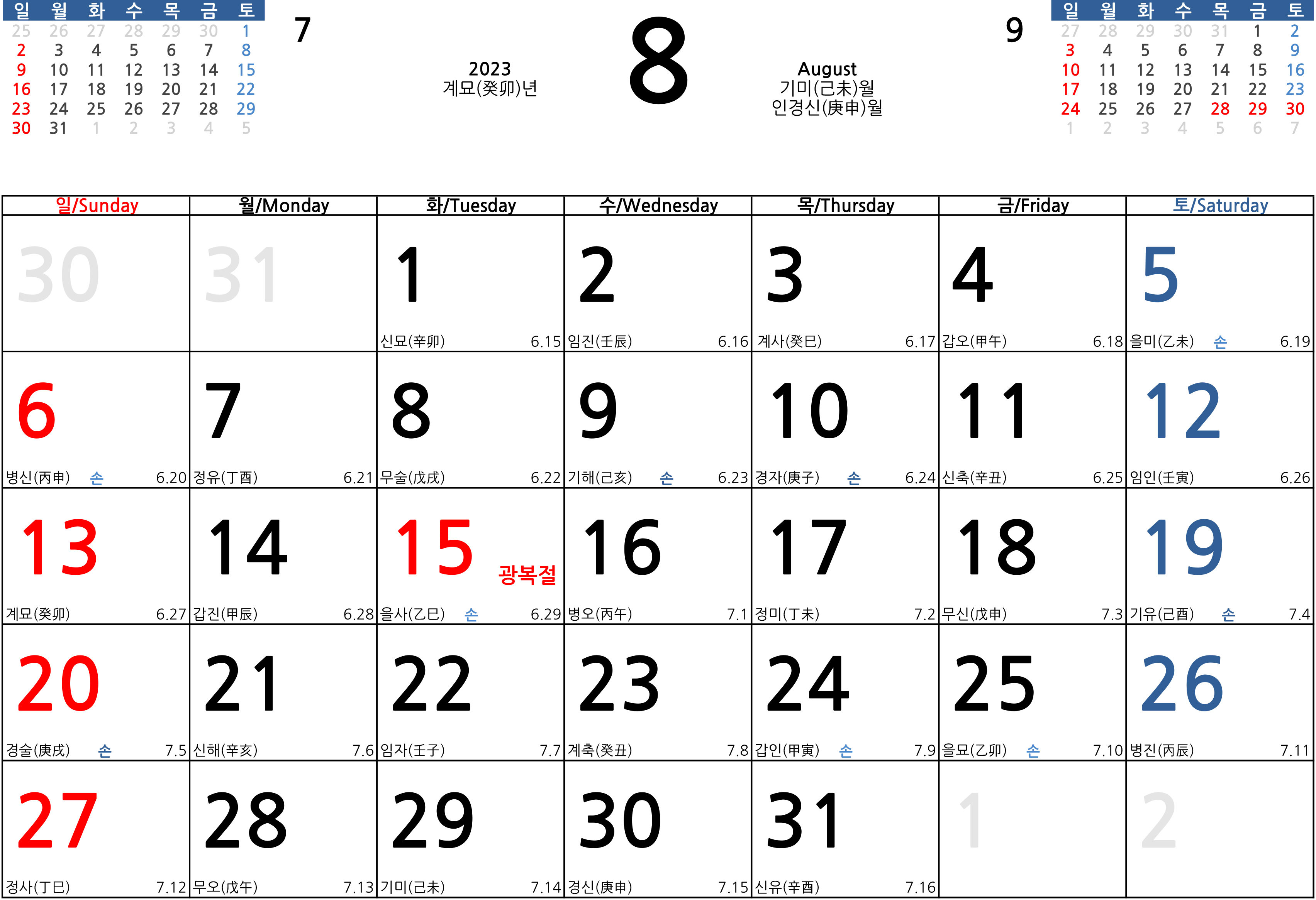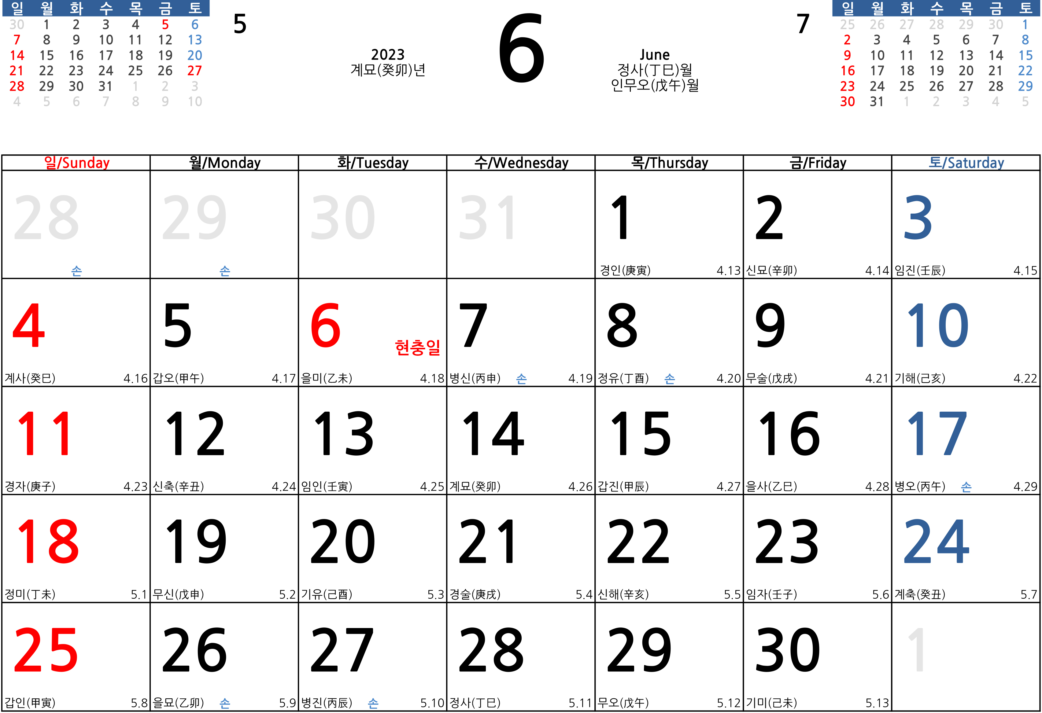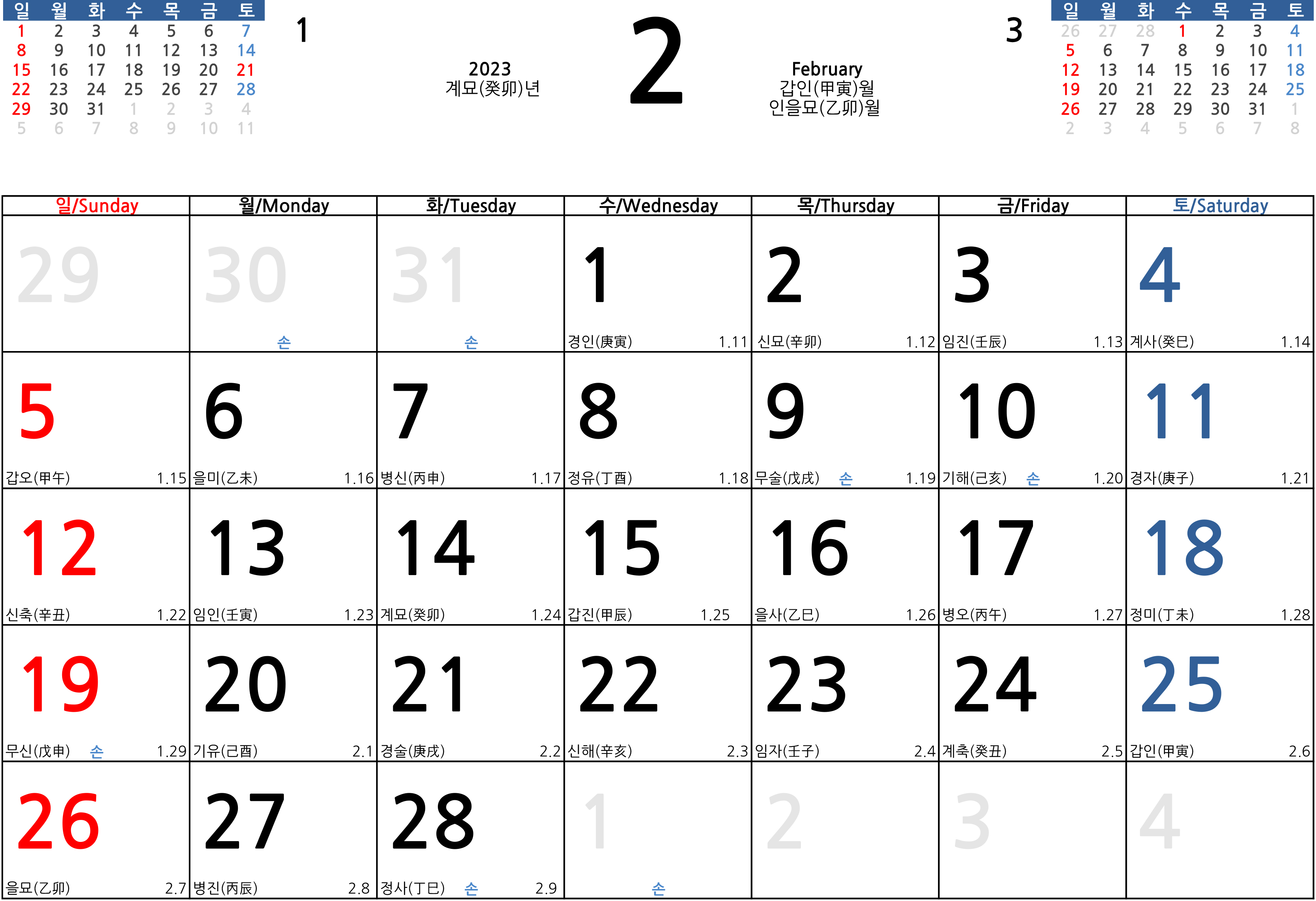 상단에는 해당되는 달력의 전월과 익월이 미리보기 형식으로 표기가 되어있고요. 빨간 날인 법정공휴일은 모두 빨간색으로 체크를 했습니다. 또한 일요일은 빨간색, 토요일은 파란색으로 표기를 했으며 상단에 각 연도와 해당되는 월에 12 간지를 표기를 했습니다.