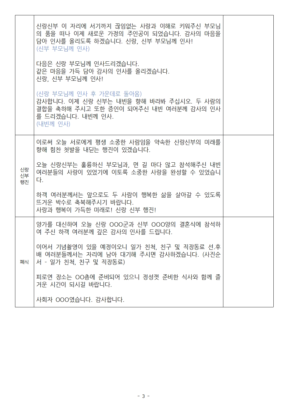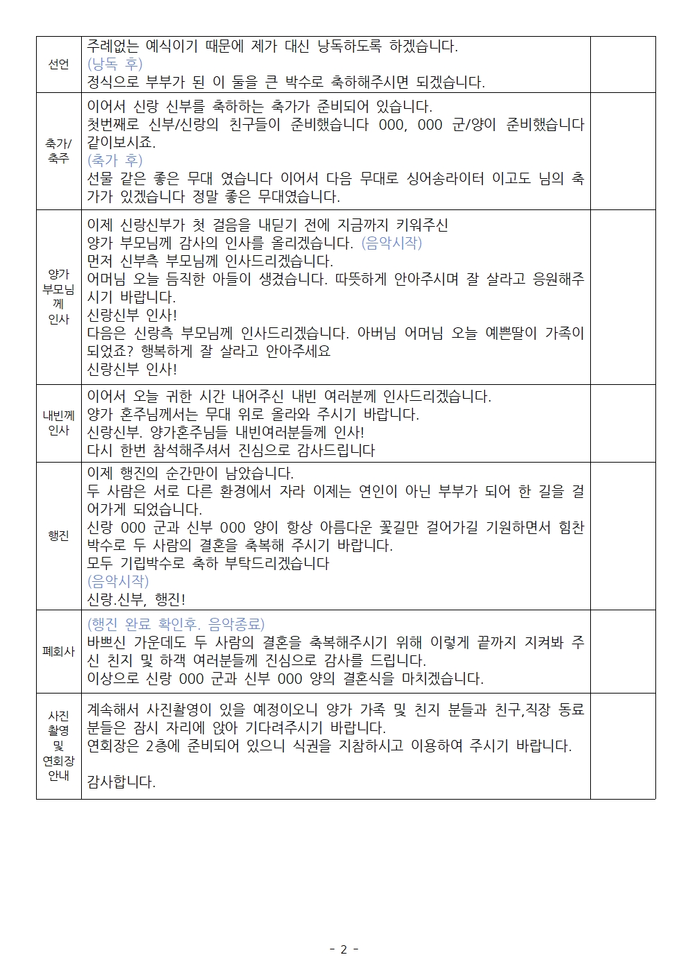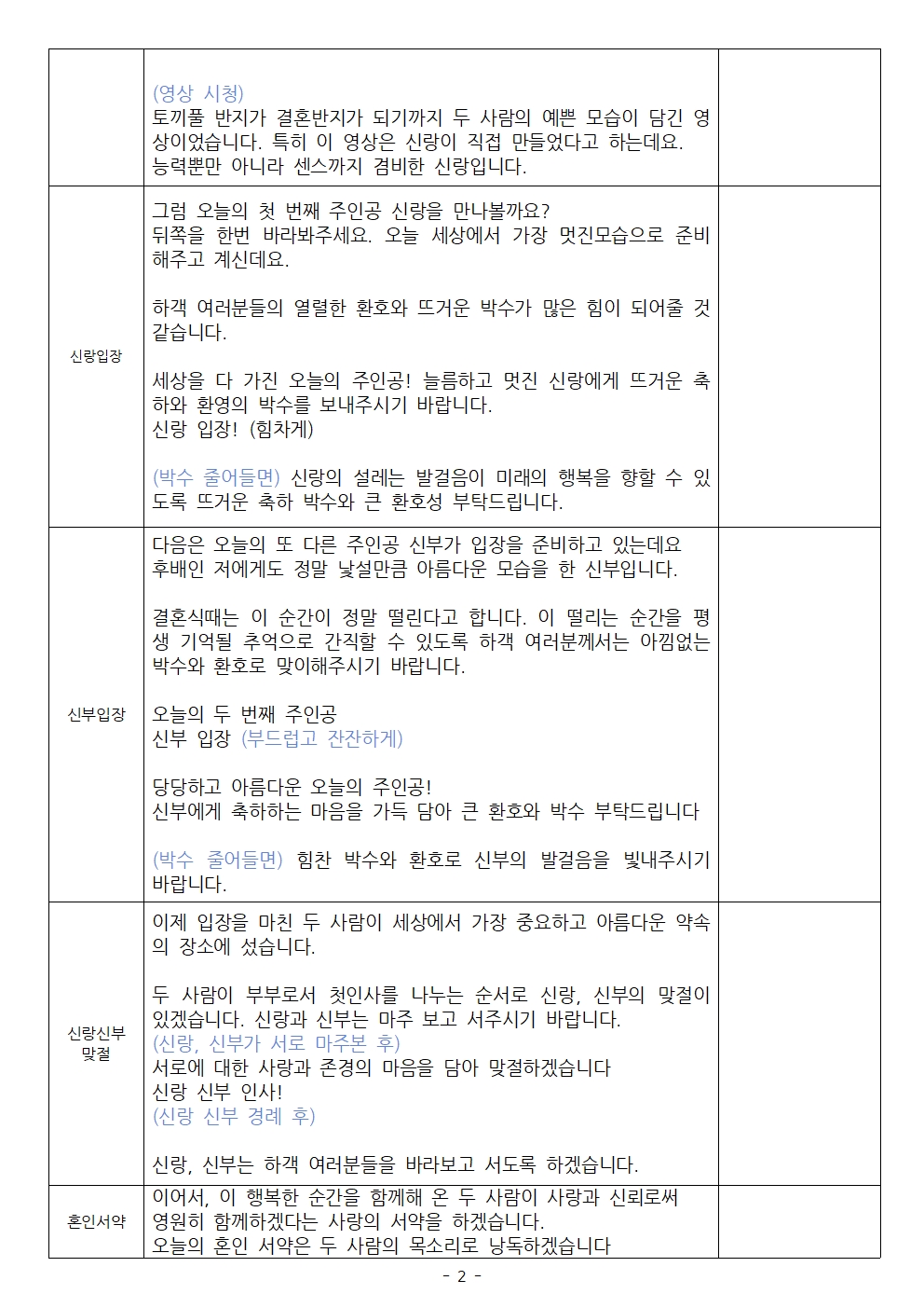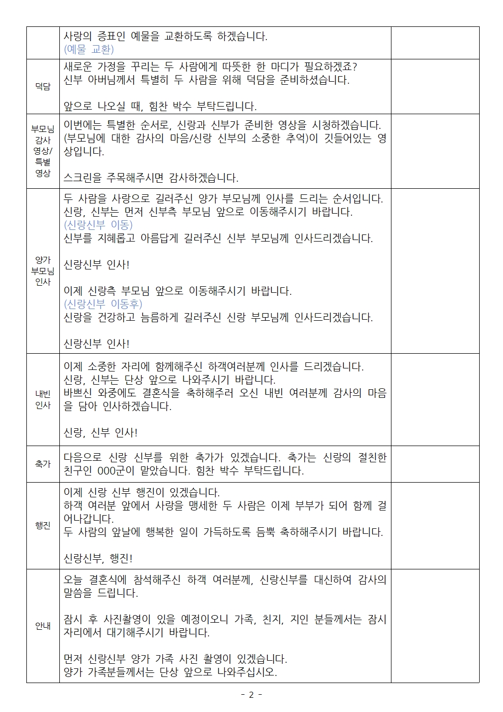 이상 오늘은 결혼식 사회 대본 파일 공유와 함께 관련 페이지와 서비스까지 알아보는 시간이었습니다. 도움 되는 자료가 되셨다면 댓글 또는 공감을 남겨주시면 큰 힘이 됩니다.