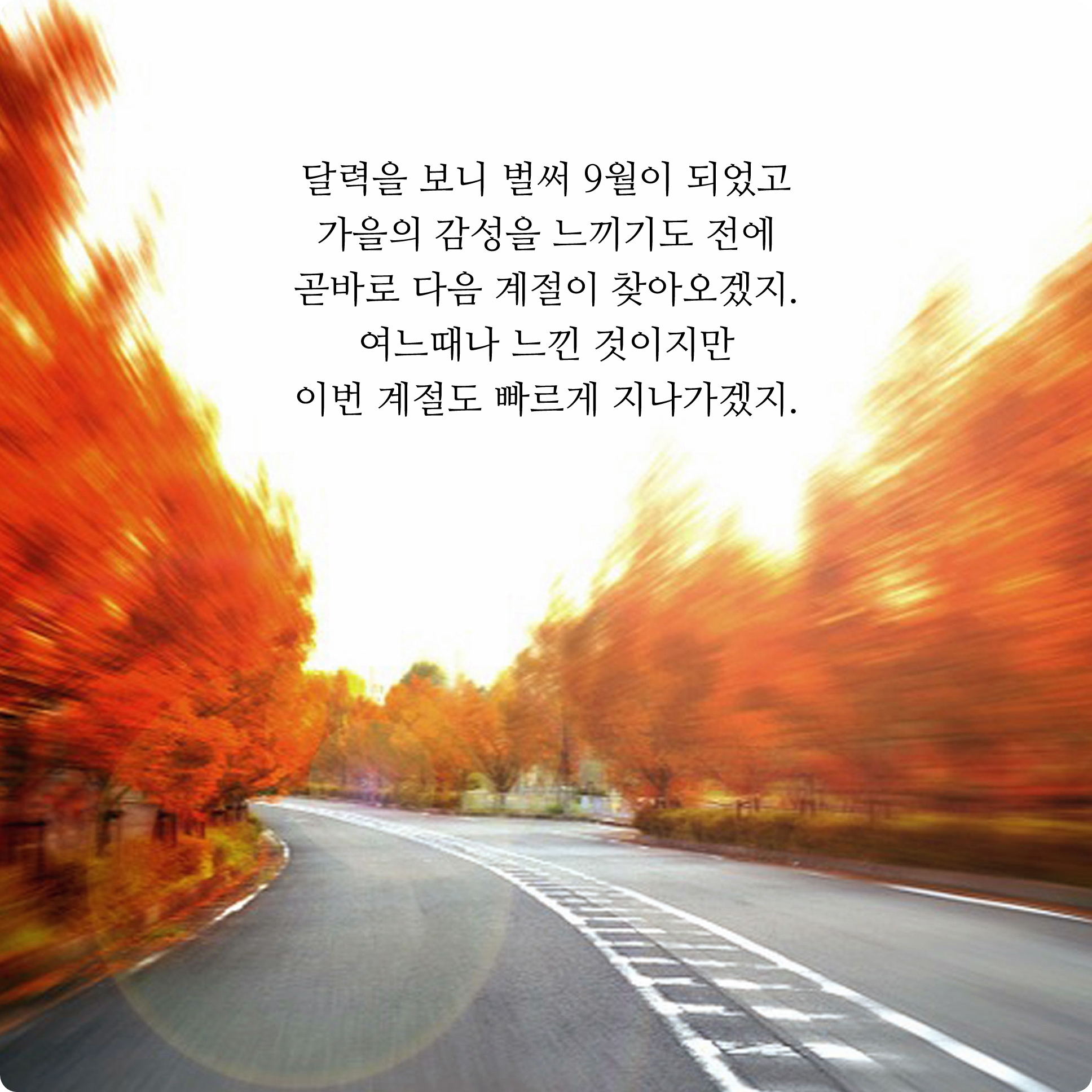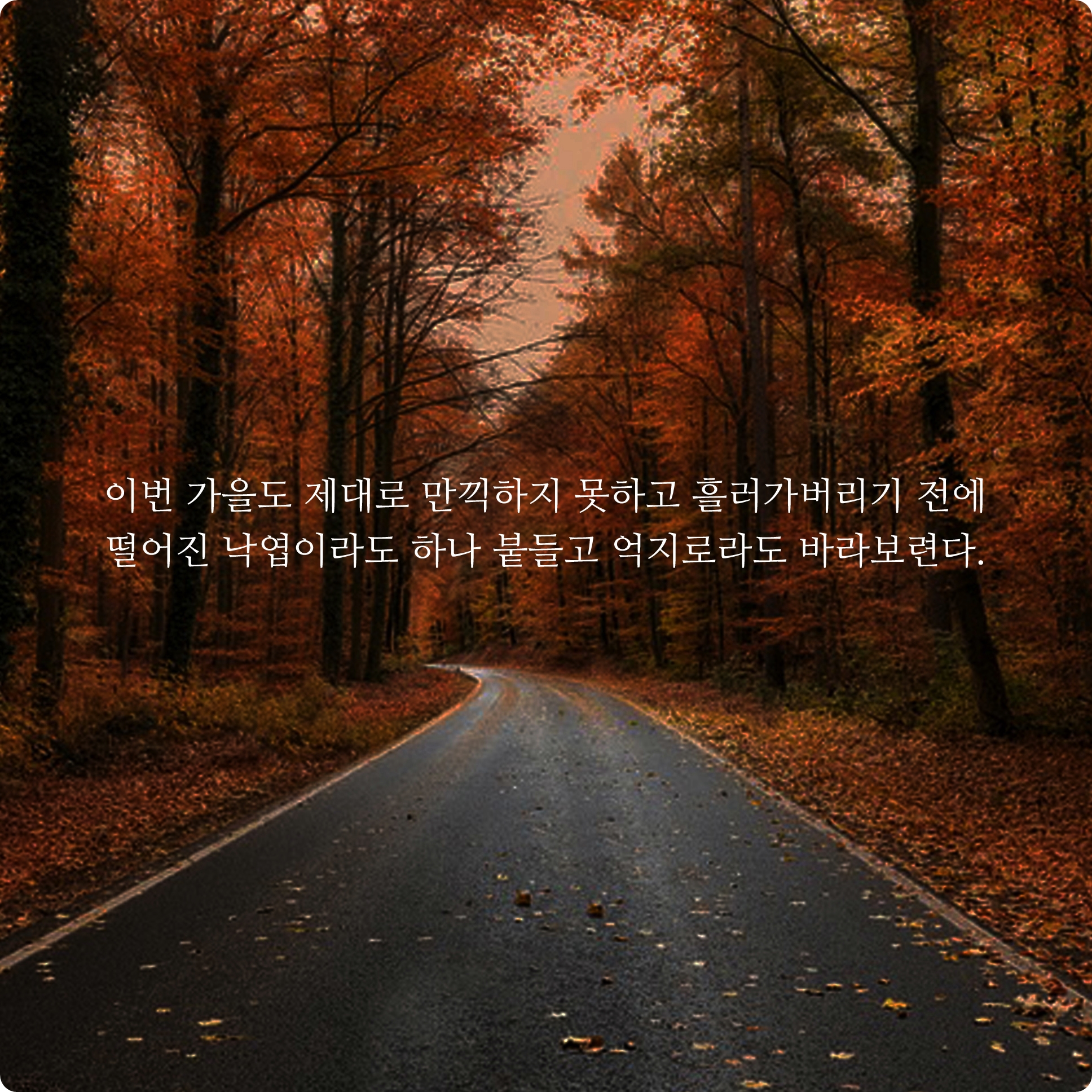 저에겐 가을이란 가을의 감성을 느낄새 없이 유독 빠르게 흘러가버렸던 계절인 것 같습니다. 그래서 그런 계절을 조금더 보고 느껴보고 만끽하면서 보내고 싶습니다.