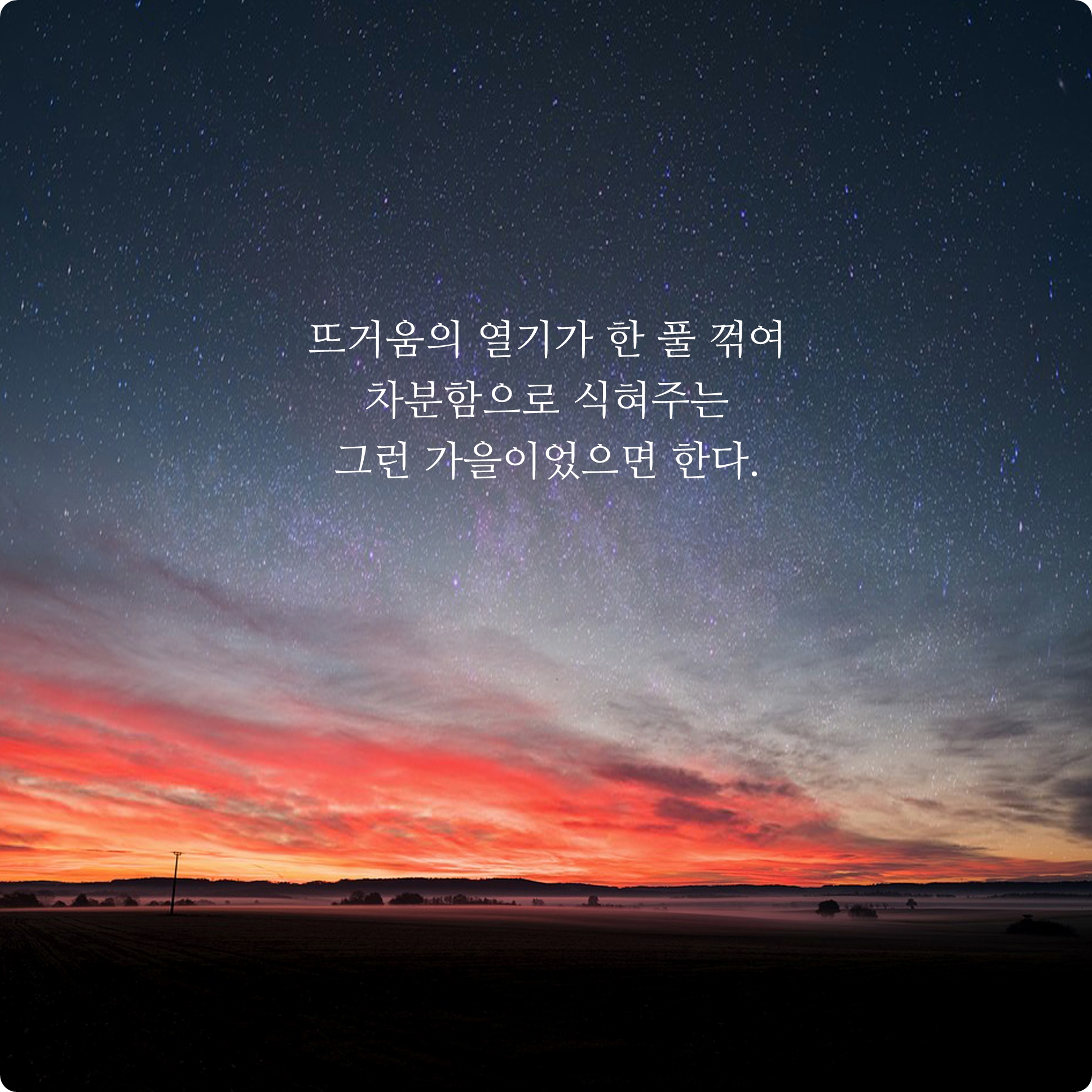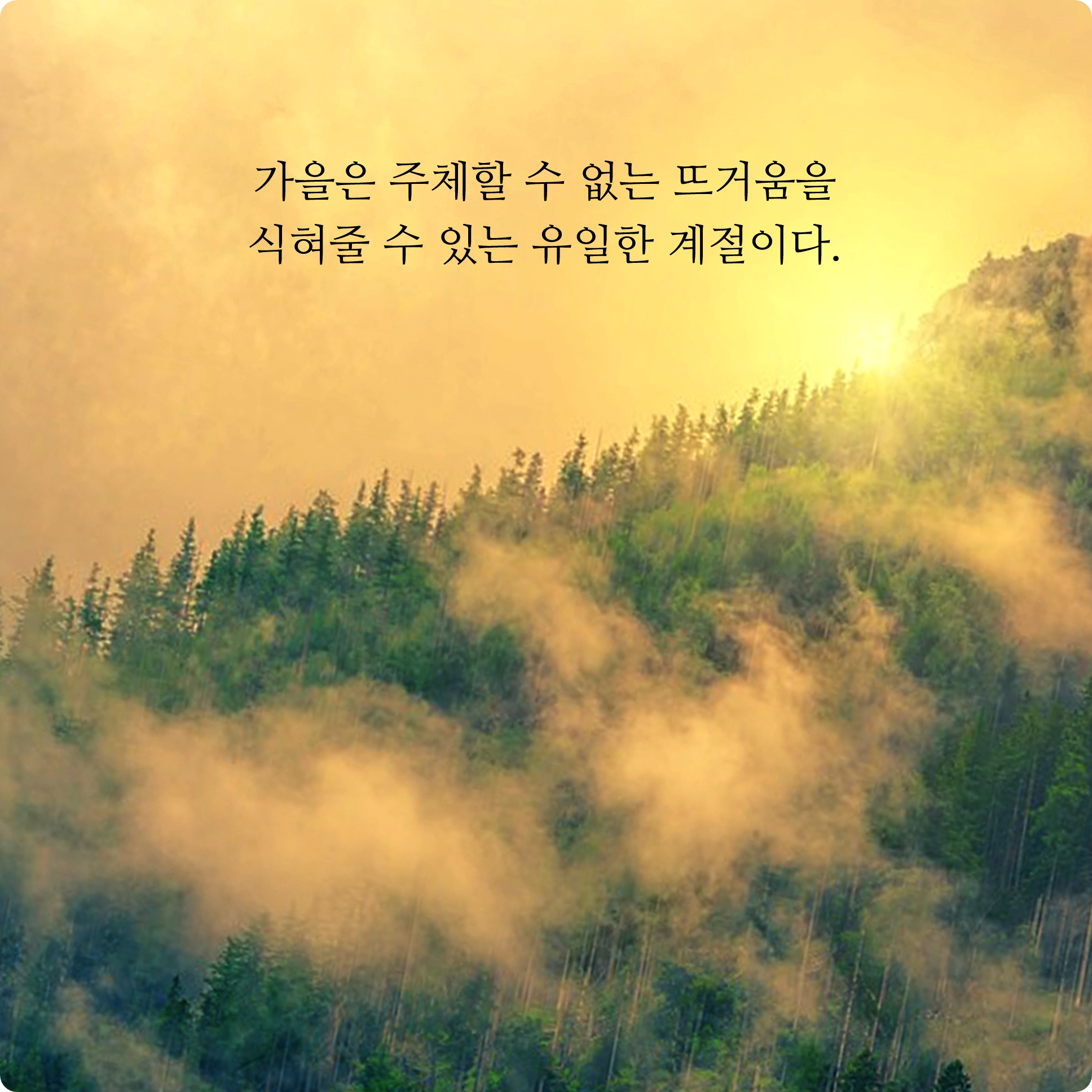 때론 열정적이었던 뜨거웠던 계절이 지나 이제는 잠시 그런 열기를 식혀줄 계절. 바로 가을이 아닐까요? 뜨거웠었던 계절이 누그러지고 점점 더 시원해지는 계절. 바로 가을이죠. 인생에 있어서 이런 변화의 시기도 필요합니다.