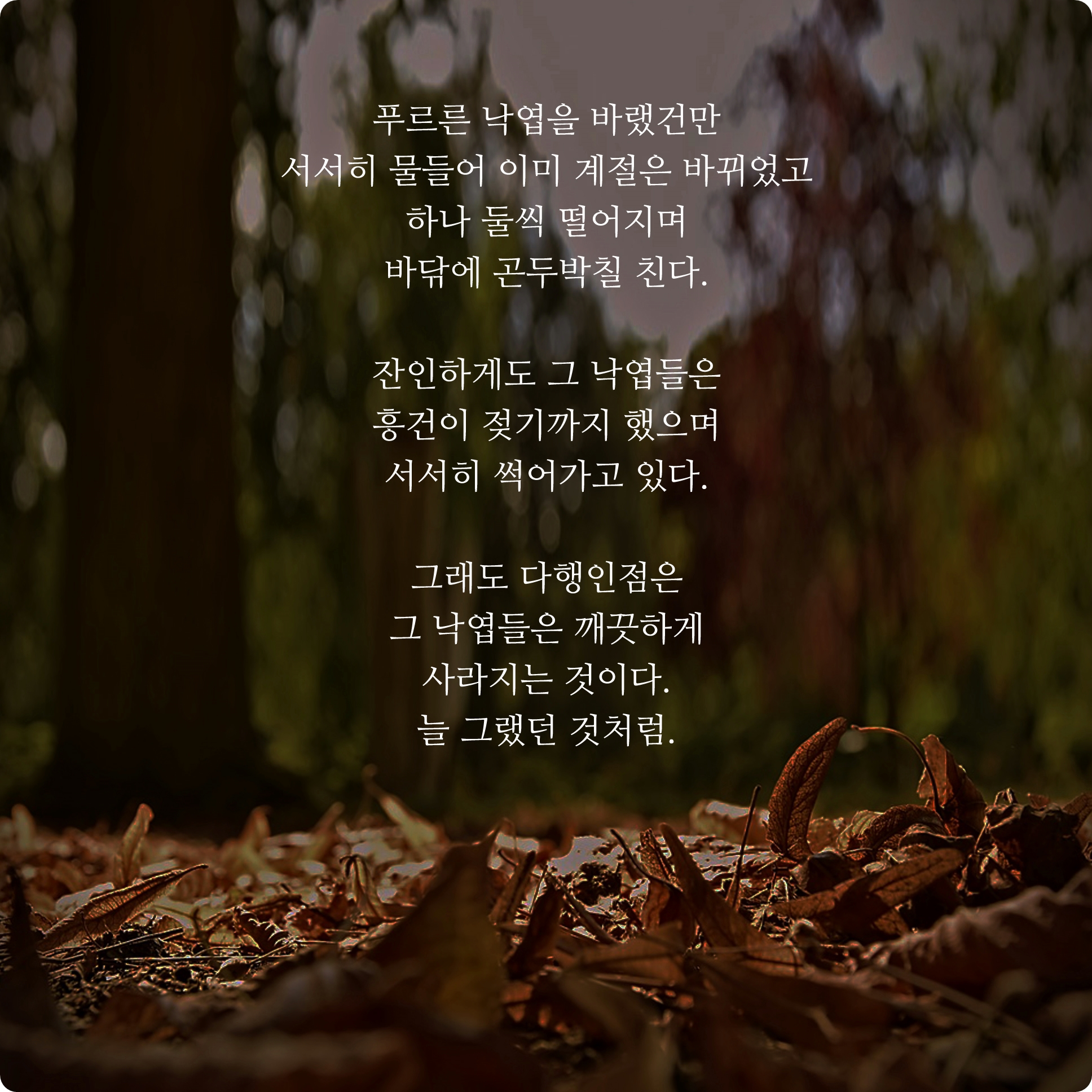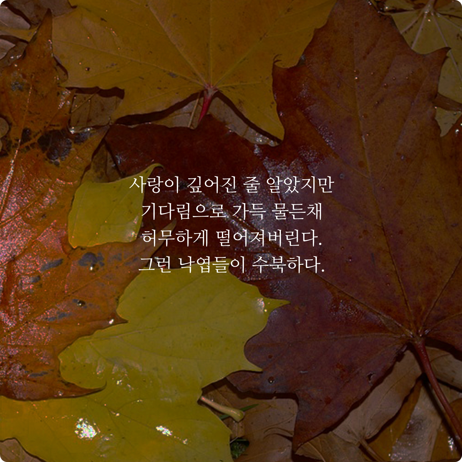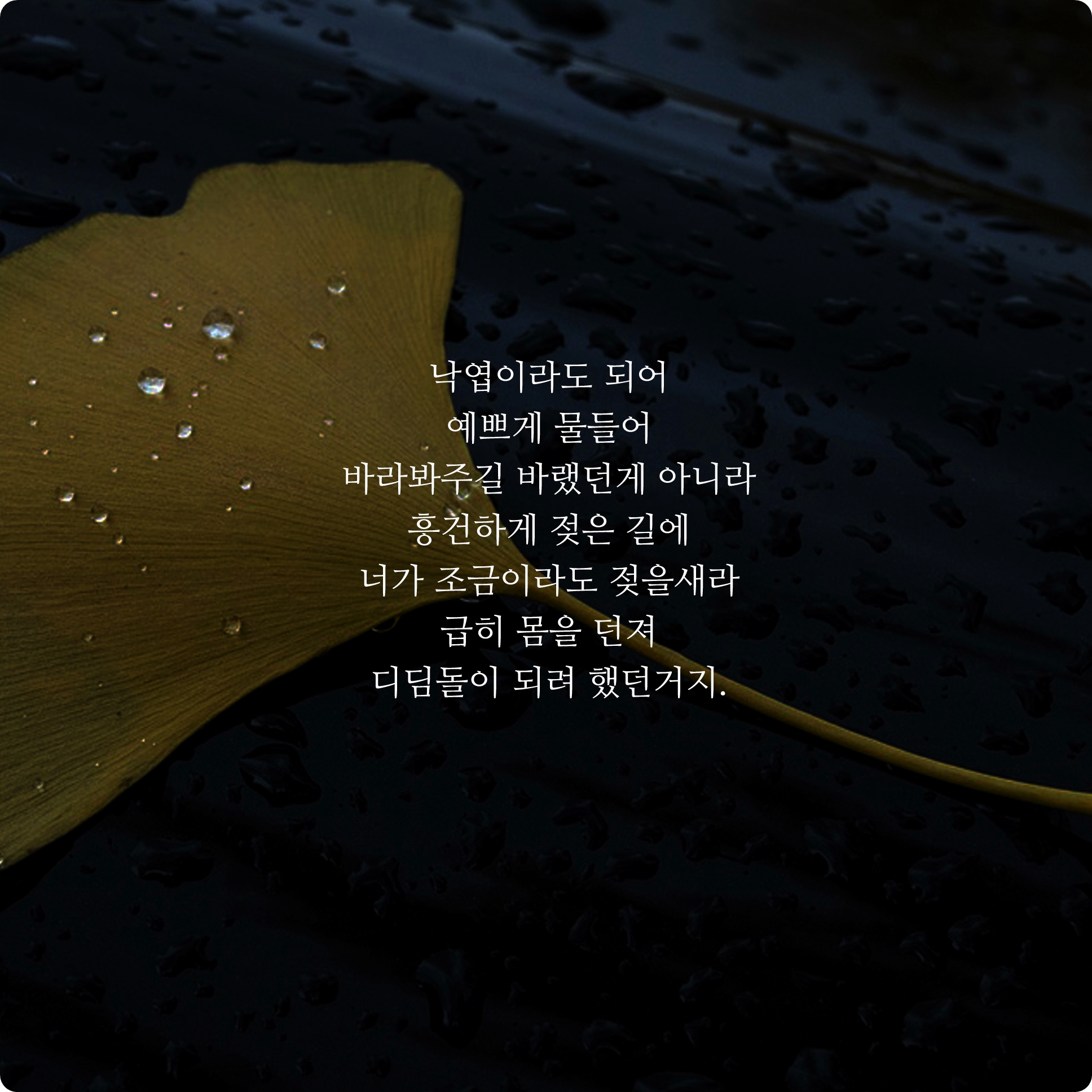 낙엽이라도 되어 예쁘게 물들어 바라봐주길 바랬던게 아니라 흥건하게 젖은 길에 너가 조금이라도 젖을새라 급히 몸을 던져 디딤돌이 되려 했던거지.