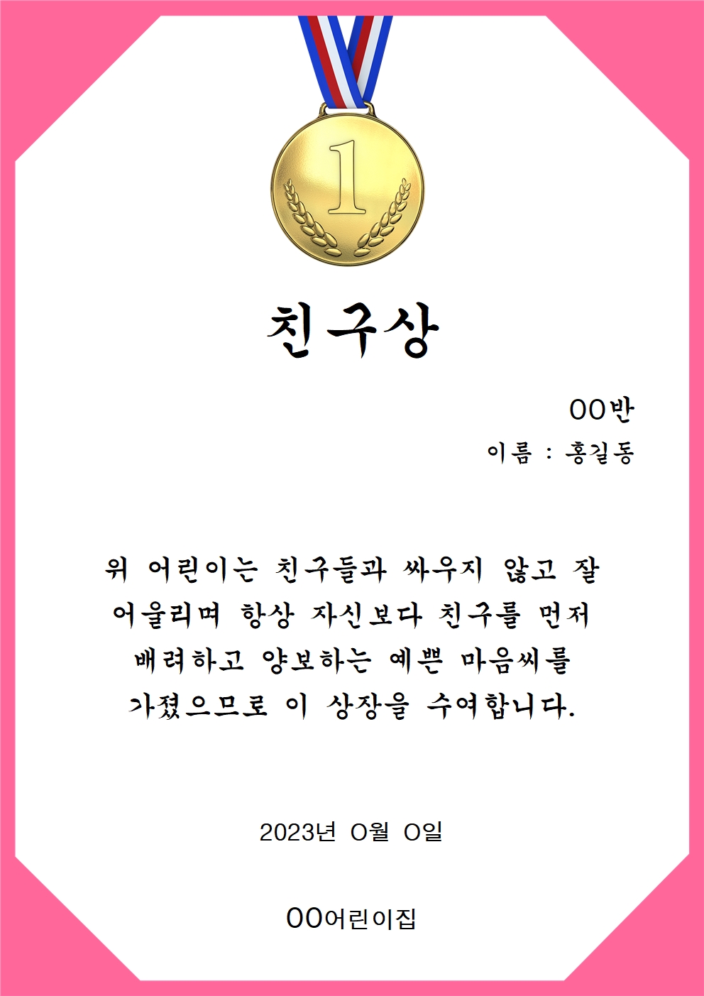 위 어린이는 친구들과 항상 즐겁게 잘 어울리며 친구를 배려하고 양보하는 이쁜 마음씨를 가졌으므로 이 상장을 수여합니다.