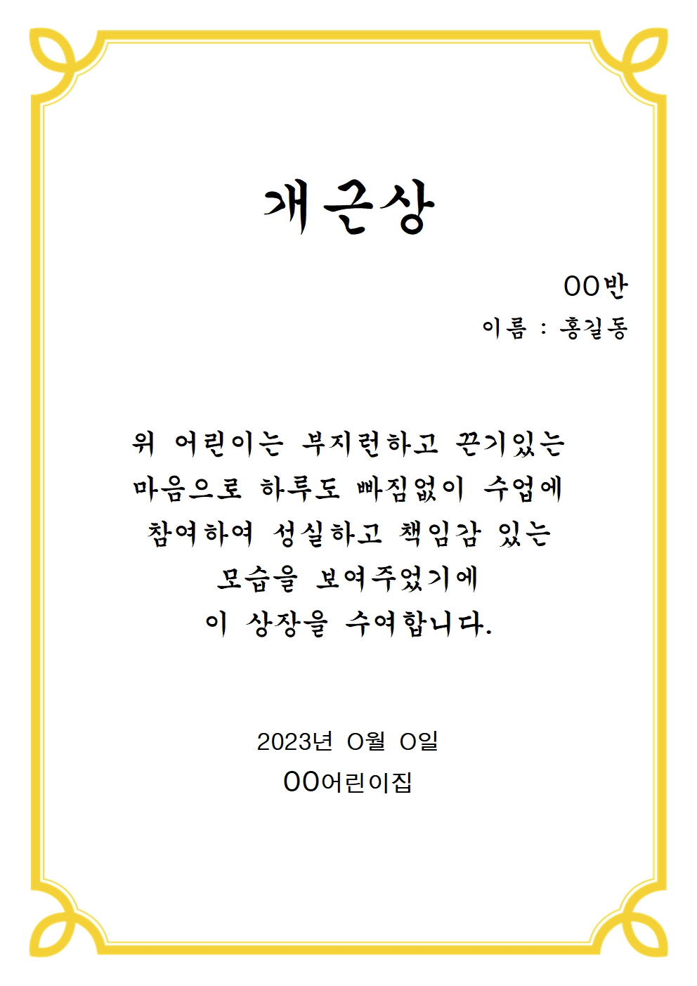 마찬가지로 상 내용과 함께 하단 날짜, 어린이집(유치원명)을 편집하시면 됩니다.