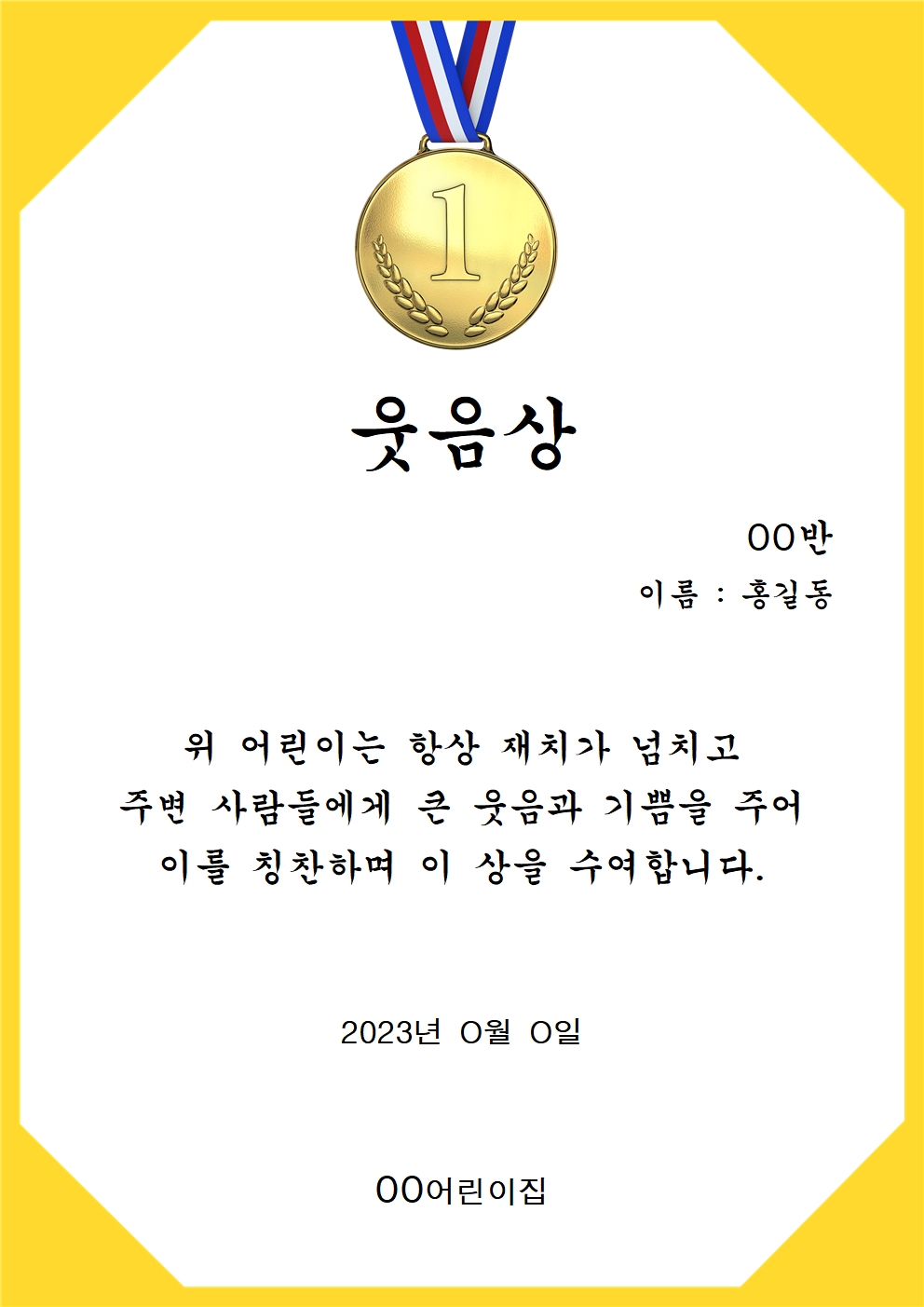 위 어린이는 항상 천사 같은 미소로 밝고 긍정적인 모습으로 친구들과 선생님에게 기쁨을 주었으므로 이 상장을 수여합니다.