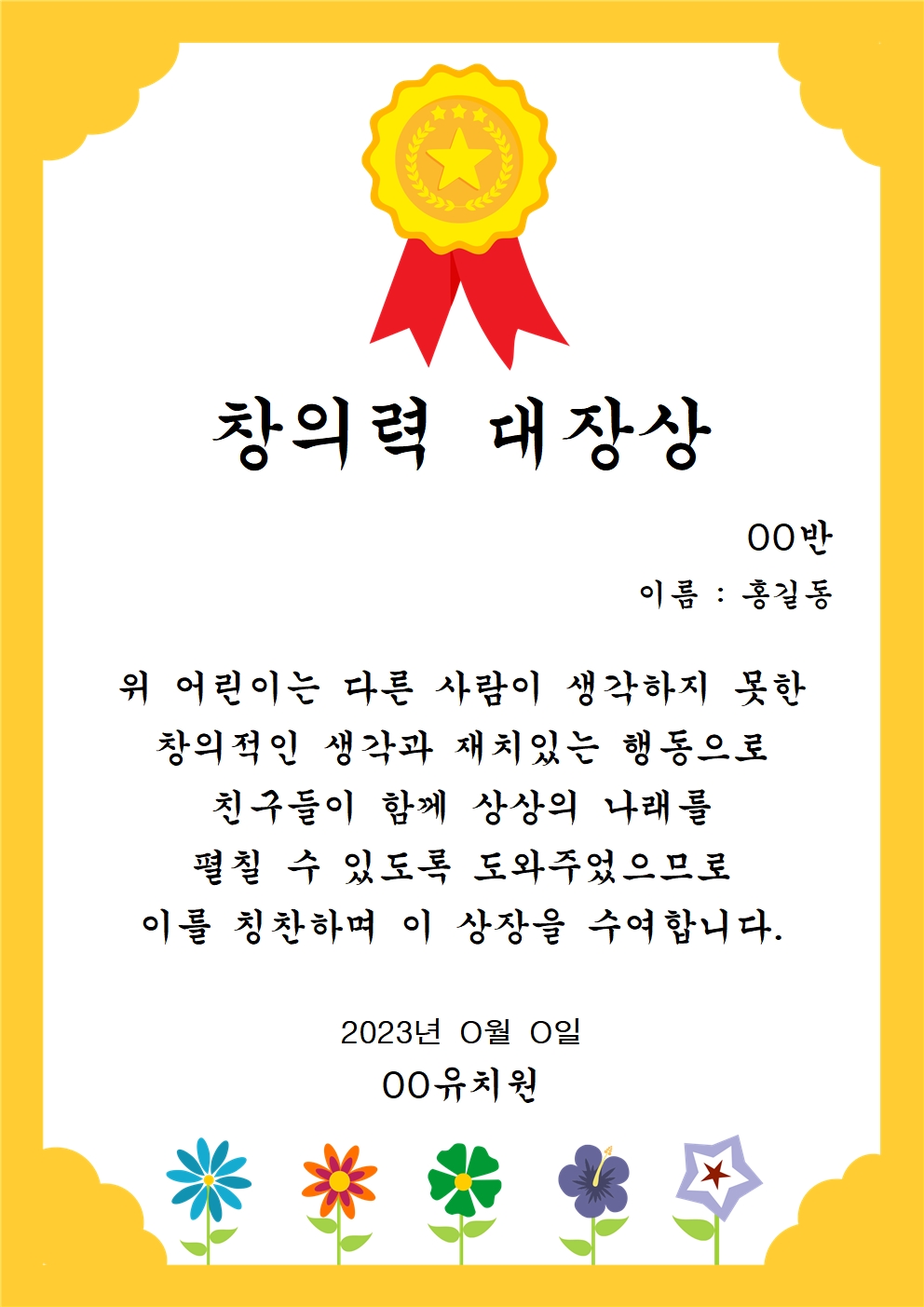 위 어린이는 다른 사람이 생각하지 못한 창의적인 생각과 재치있는 행동으로 친구들이 함께 상상의 나래를 펼칠 수 있도록 도와주었으므로 이를 칭찬하며 이 상장을 수여합니다.