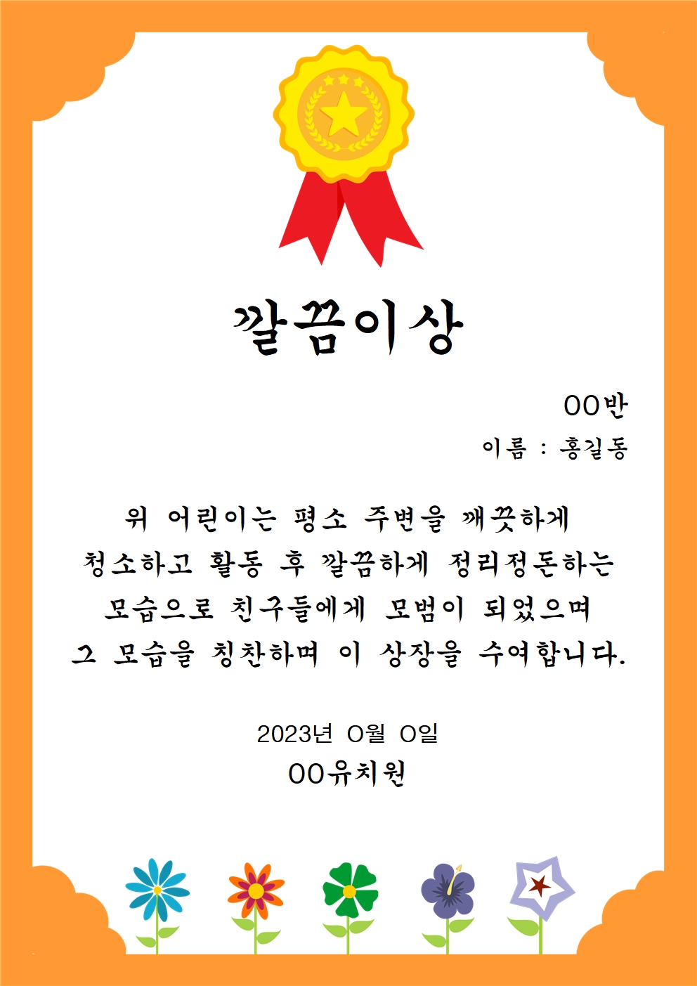 만약 좀 더 심플한 상장 디자인을 찾으시거나 꽃 모양 또는 기타 다양한 상 종류의 문구(총 30여개)를 찾으신다면 위의 첨부된 '어린이집 상장 문구 도안 17종 무료 다운로드' 게시글을 방문하시면 됩니다. 이상 도움이 될 수 있는 자료가 되셨길 바랍니다. 방문해주셔서 감사합니다.