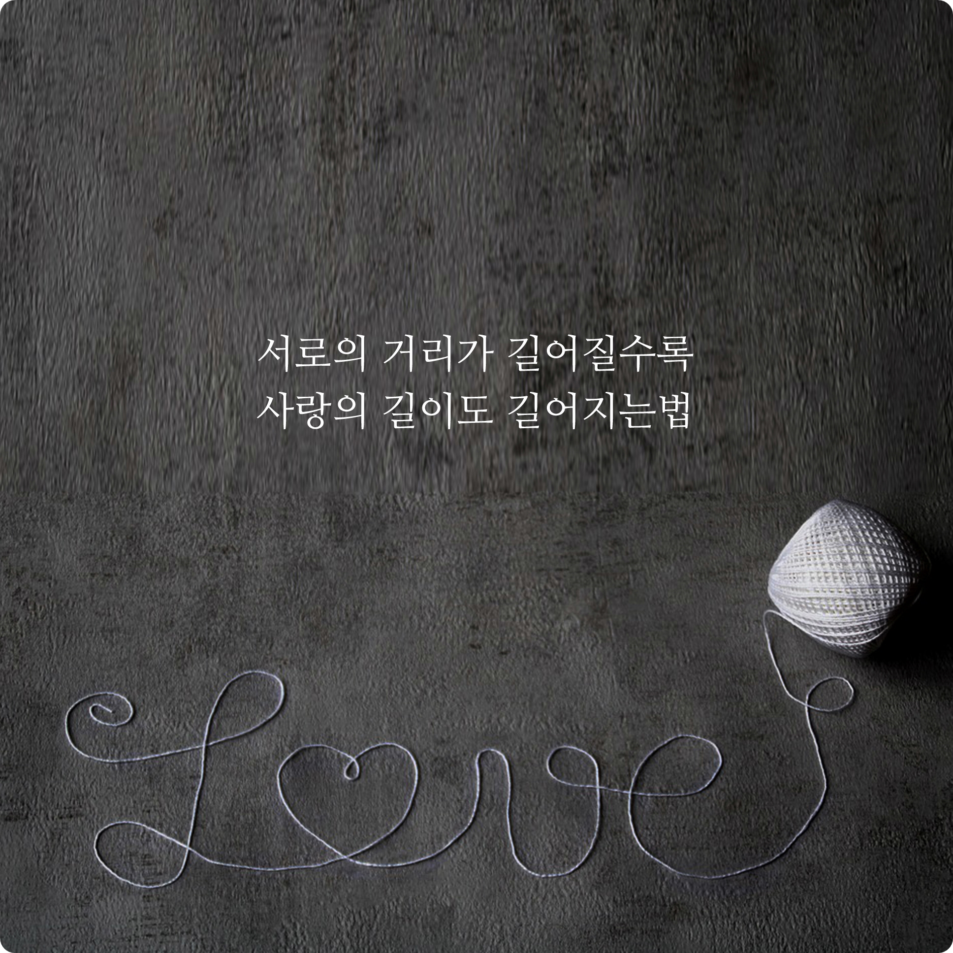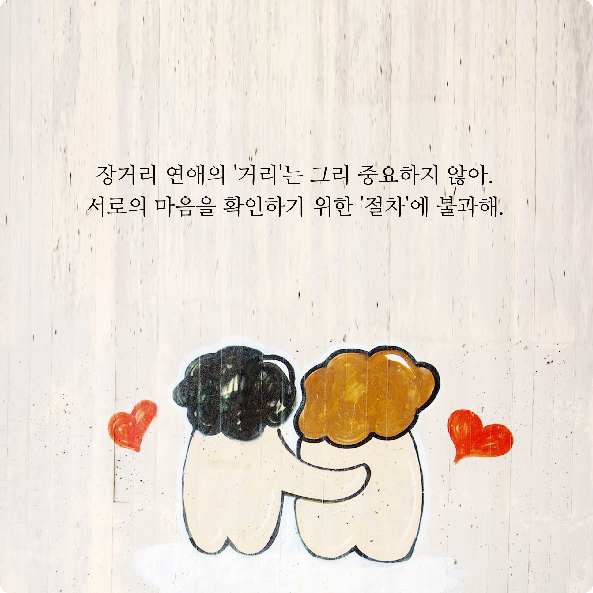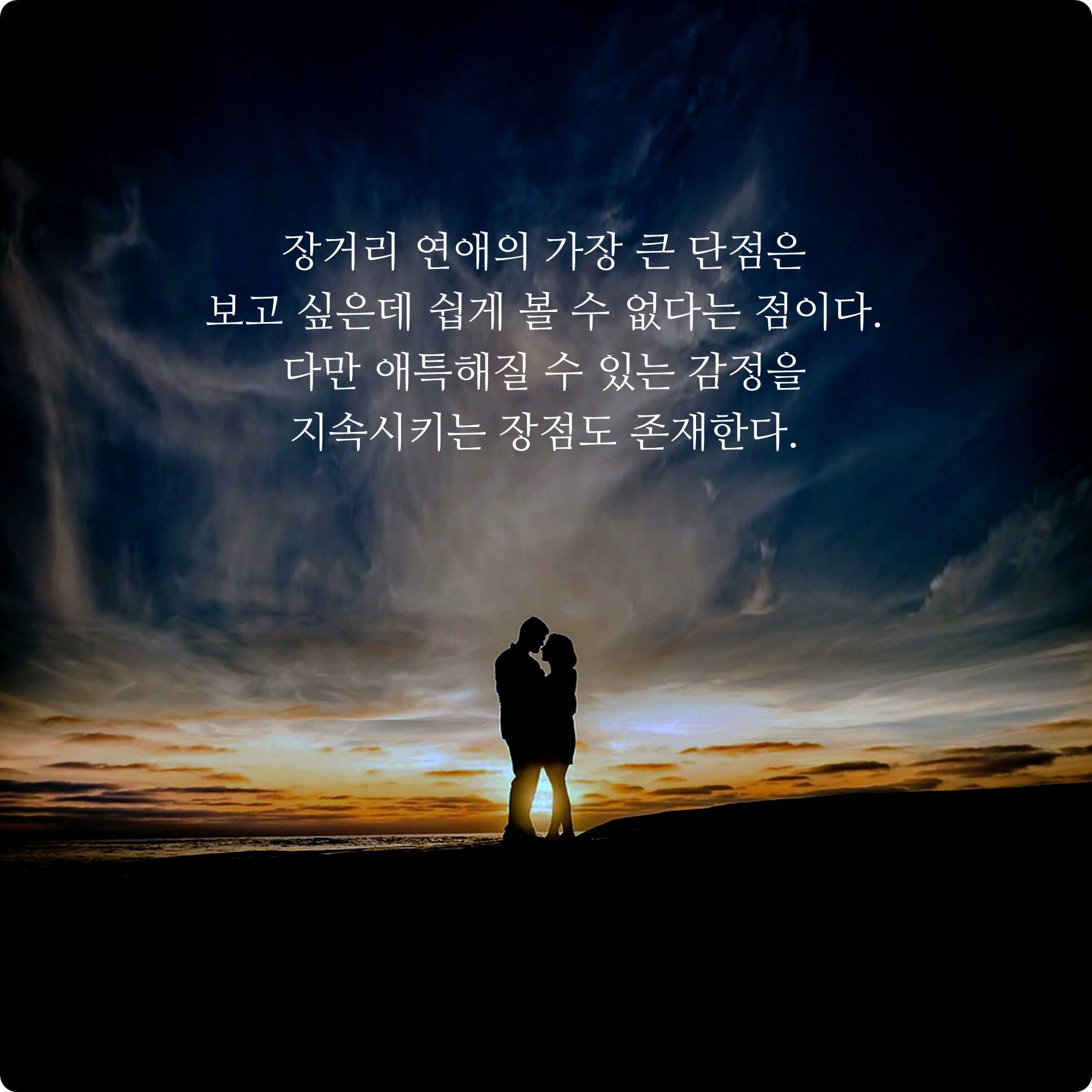 세상은 모두 수많은 사람들의 무모한 도전을 통해 지금 현재를 이루게 되었고 그러한 도전에 따른 결과들로 하여금 더 나은 미래를 그려나갈 수 있는 확고한 희망을 갖게 된 것처럼, 어떠한 불변의 상황과 역경도 결국엔 우리가 극복해야할 당연한 과제인지도 모릅니다. 장거리 연애 또한 지금 현재의 부족함없는 깊은 사랑을 하고 있다면 서로 둘만이 극복해나가야할 하나의 작다한 디딤돌일 수 있죠. 어쩌면 그 디딤돌은 더욱 더 깊은 사랑을 위해 반드시 필요한 과정인지도 모릅니다.