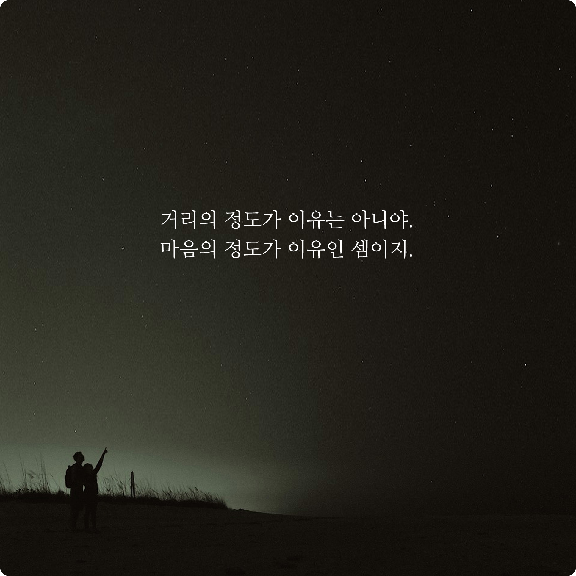 어쩌면 거리는 중요하지 않은지도 몰라요. 깊어질 사랑을 위한 서로의 마음을 알기 위한 하나의 '절차'일 수 있죠. 개인적으로는 지금 현재의 연애에 처해진 모든 역경들과 난관은 더욱 더 깊어질 사랑을 위한 반드시 필요한 과정이 되었으면 합니다.