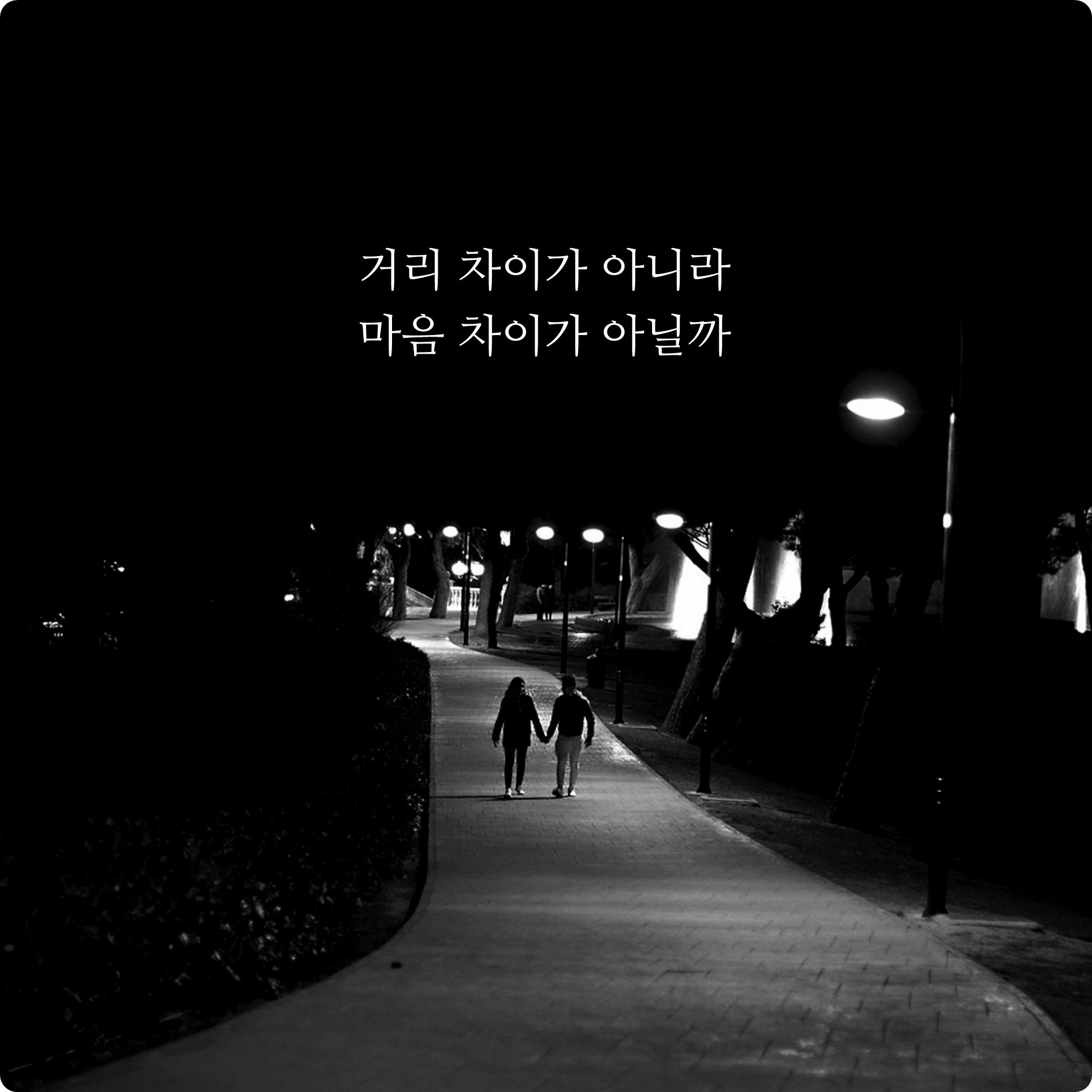 너와 내가 멀리 떨어져 있는 거리. 점차 우리의 사랑도 이 공간적인 거리처럼 마음또한 멀어지는 것은 아닐까요? 흔히 우리가 장거리 연애의 가장 큰 단점은 거리가 멀어질수록 우리 둘의 마음의 거리 또한 멀어진다고 생각하는 사회적 인식들이 깊에 깔려 있는 것 같습니다. 이에 대한 해답은 우리 둘만의 사랑에 달려있는 것 아닐까요?