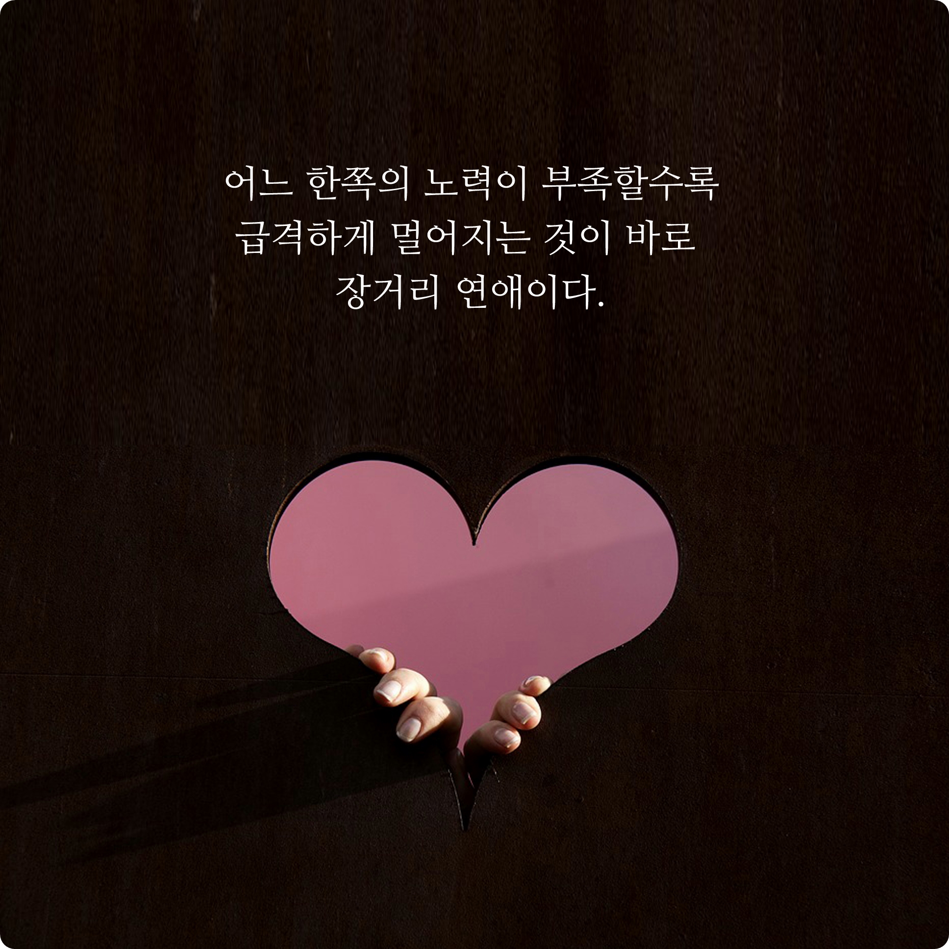 거리가 멀기 때문인지 서로의 충분한 노력이 이루어져야만 이어나갈 수 있는 것이 장거리 연애가 아닐까요. 쉽게 만날수도 없고 어느 한쪽의 마음으로만 이어나갈 수 없죠. 어느 한쪽의 노력 또는 그 마음의 정도가 부족해진다면 '거리'라는 사랑의 장애물이 이별이라는 명분을 확고히 만들며 이별을 더욱 더 급격한 속도로 다다르게 하게 됩니다.