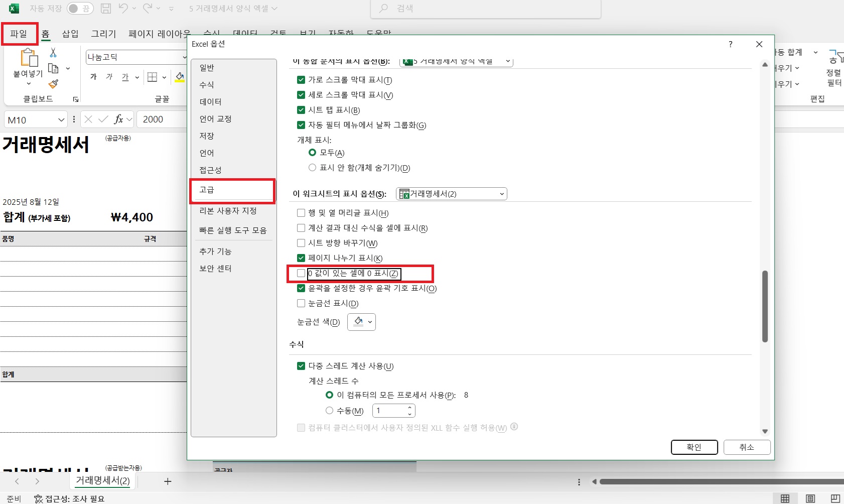 4. [0값이 있는 셀에 0표시]의 체크를 해제합니다.