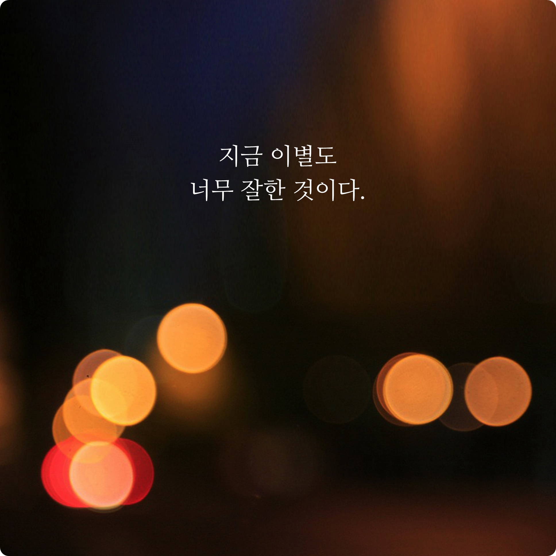 끝내 선택했던 지금의 이별도 너무 잘했답니다. 왜냐하면 더 이상 끌고 갈 수 없는 연애를 하고 있었으니깐요. 이별이라는 것은 언제나 아프고 힘든 감정들만 남게 되지만 더 나은 내 모습을 위해 가장 필요했던 이별인지도 몰라요. 부정의 상황 뒤에 항상 긍정의 전환점으로 삼는 삶의 자세가 필요합니다.