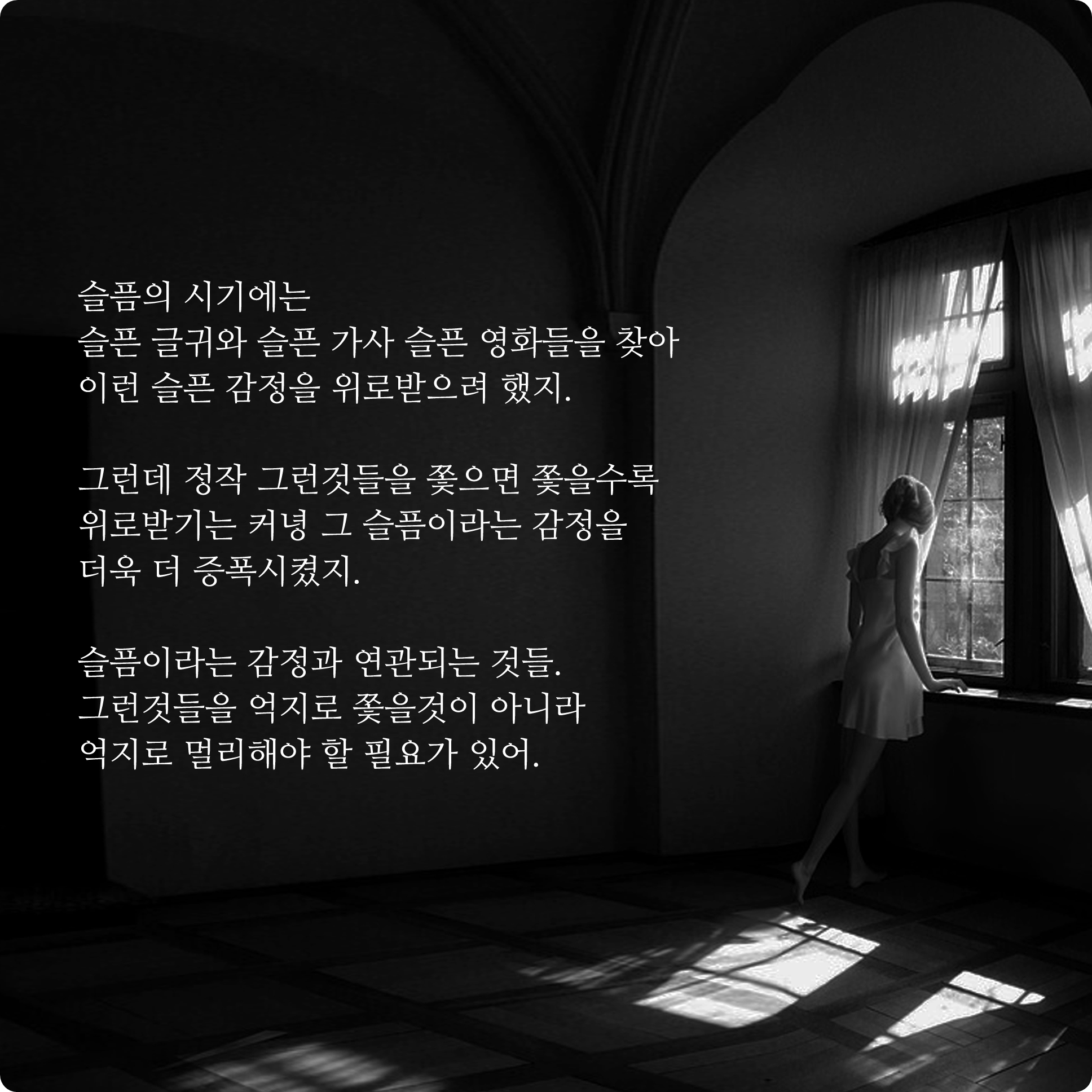 슬픔의 시기에는 슬픈 글귀와 슬픈 가사 슬픈 영화들을 찾아 이런 슬픈 감정을 위로받으려 했지. 그런데 정작 그런것들을 쫓으면 쫓을수록 위로받기는 커녕 그 슬픔이라는 감정을 더욱 더 증폭시켰지. 슬픔이라는 감정과 연관되는 것들. 그런것들을 억지로 쫓을것이 아니라 억지로 멀리해야 할 필요가 있어.