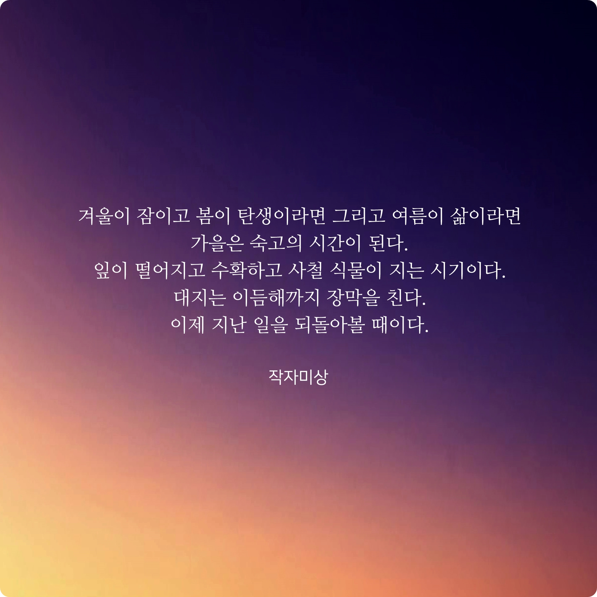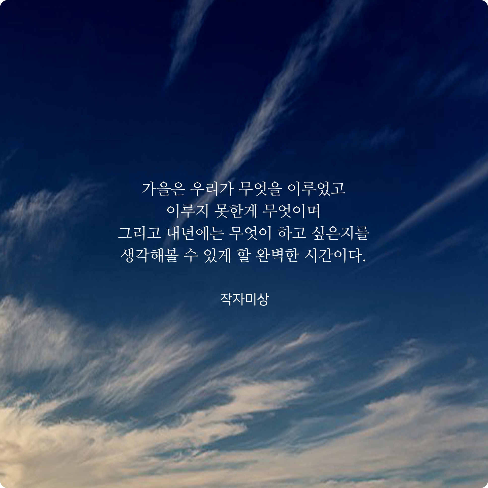 가을은 우리가 무엇을 이루었고 이루지 못한게 무엇이며 그리고 내년에는 무엇이 하고 싶은지를 생각해볼 수 있게 할 완벽한 시간이다.