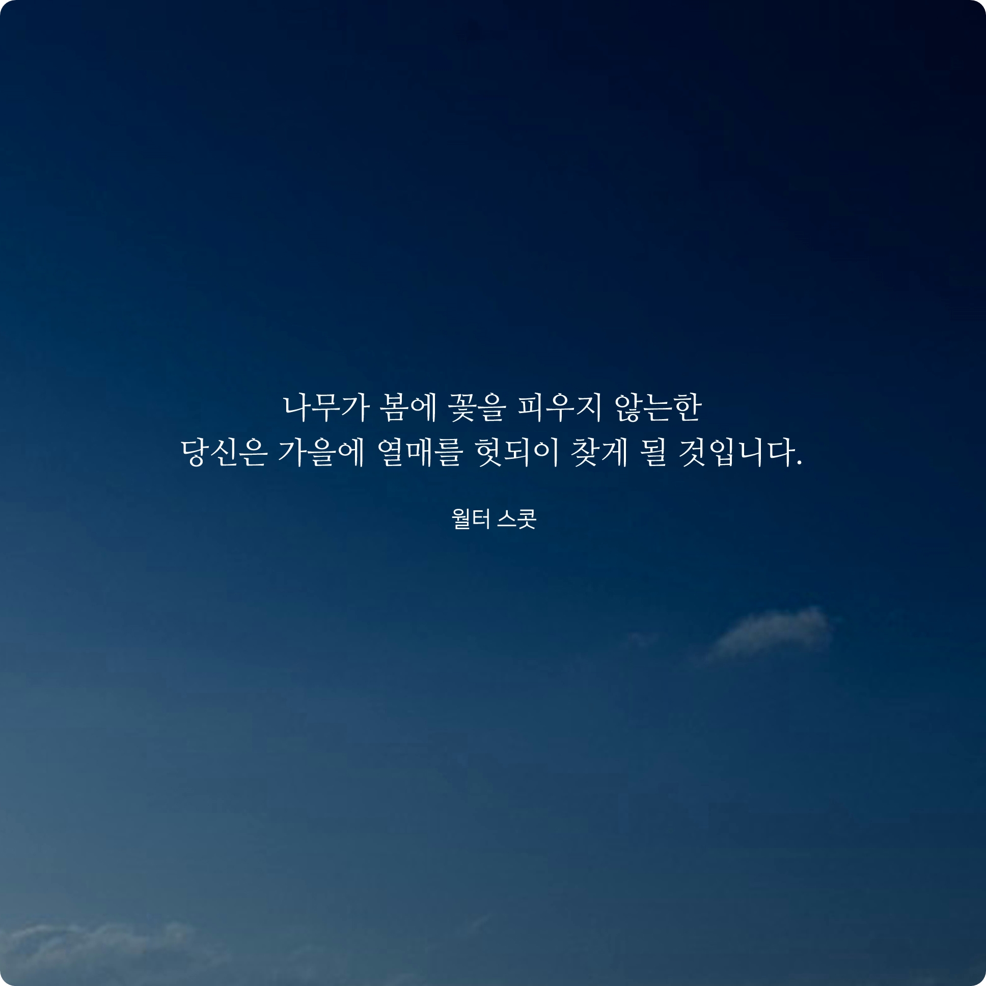 조금 깊이있게 생각하게 했던 월터스콧의 가을문구였는데요. 나무가 꽃이 피우는 것이 희망적이고 긍정적인 내용인줄 알았는데 한 번더 생각해보니까 나무에는 꽃이 절대로 필수가 없죠. 꽃이 피는 나무가 있을 수도 있겠지만 통상적으로 나무에는 꽃이 피지 않는 것처럼, 이 꽃이피지 않는한 충분히 좋은 결과를 얻기 위한 과정들을 따랐다면 가을에 좋은 결실을 얻을 수 밖에 없다는 그런 뜻입니다.