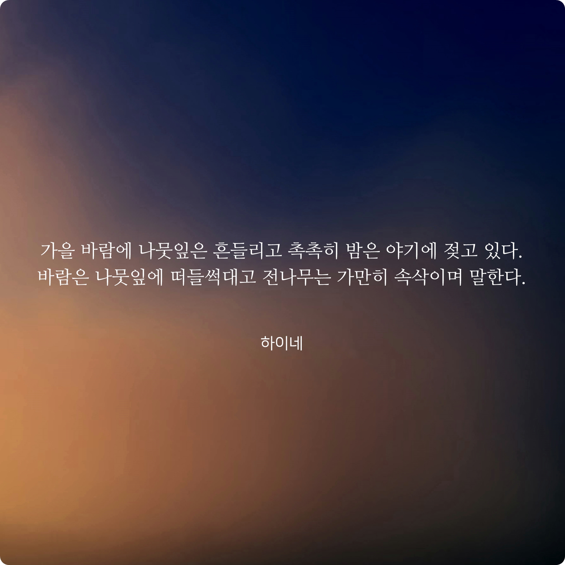 가을 바람에 나뭇잎은 흔들리고 촉촉히 밤은 야기에 젖고 있다. 바람은 나뭇잎에 떠들썩대고 전나무는 가만히 속삭이며 말한다.