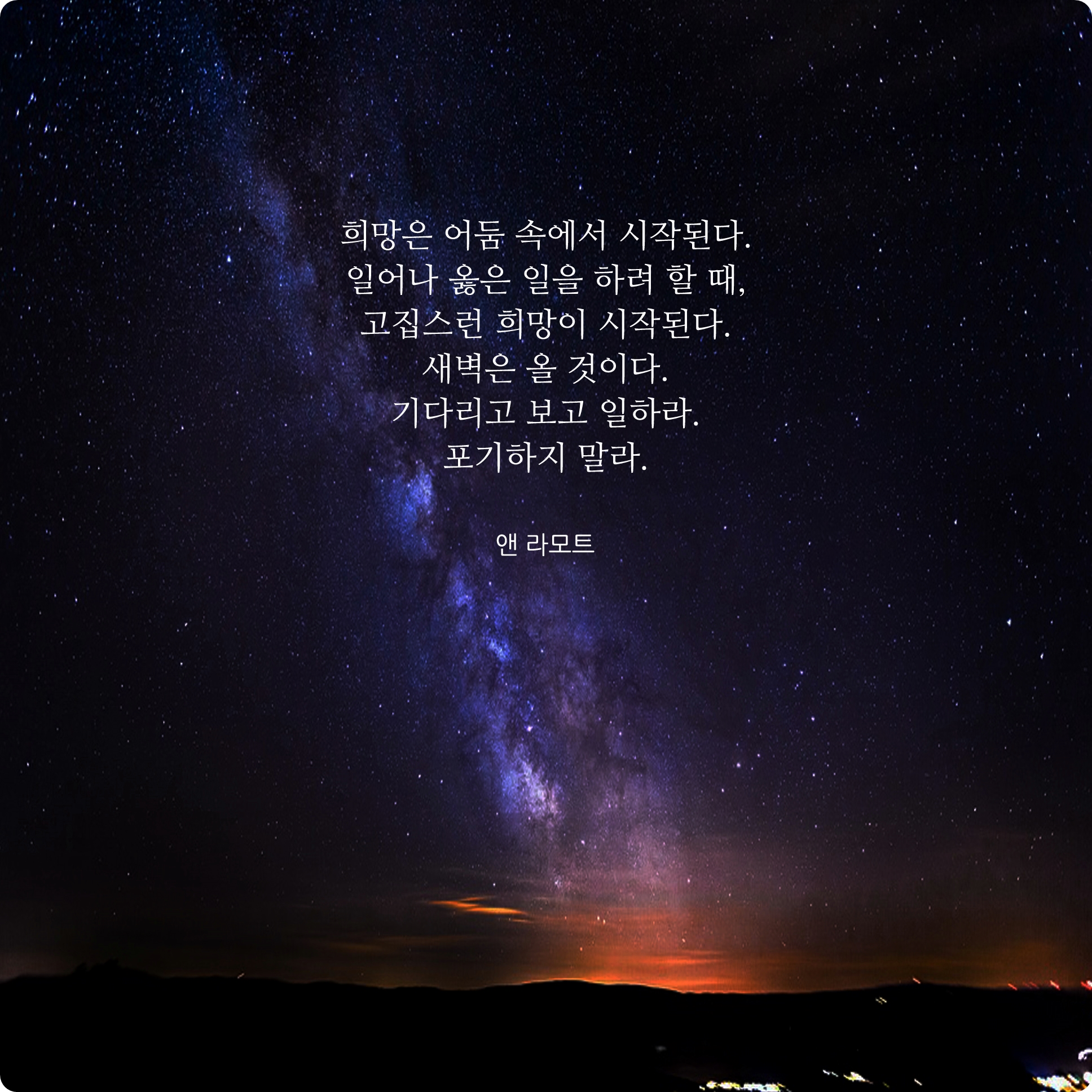 희망은 어둠속에서 시작된다. 일어나 옳은 일을 하려 할때, 고집스러운 희망이 시작된다. 새벽은 올 것이다. 기다리고 보고 일하라. 포기하지 마라.