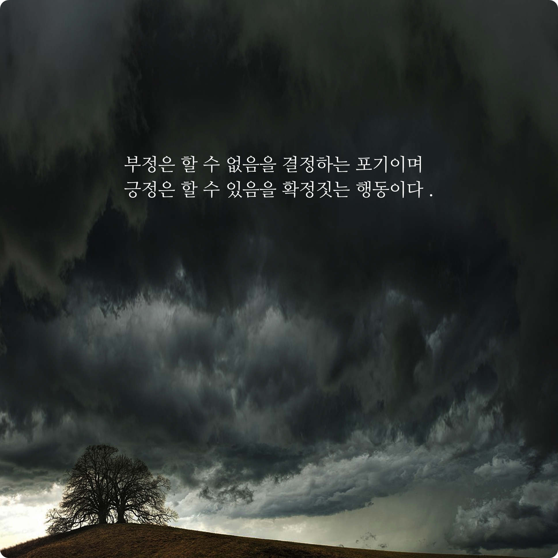 부정의 생각과 판단은 결국 그것을 부정의 결과로 스스로 판단하고 결정하며 마무리를 짓는 행위와 같습니다. 하지만 긍정의 생각은 어떠한 상황이 벌어졌다고 한들 그것을 새로운 도약, 또는 도전으로 이어집니다. 어떻게 받아들이고 어떠한 확정을 짓고 판단할지 선택은 당신의 몫입니다.