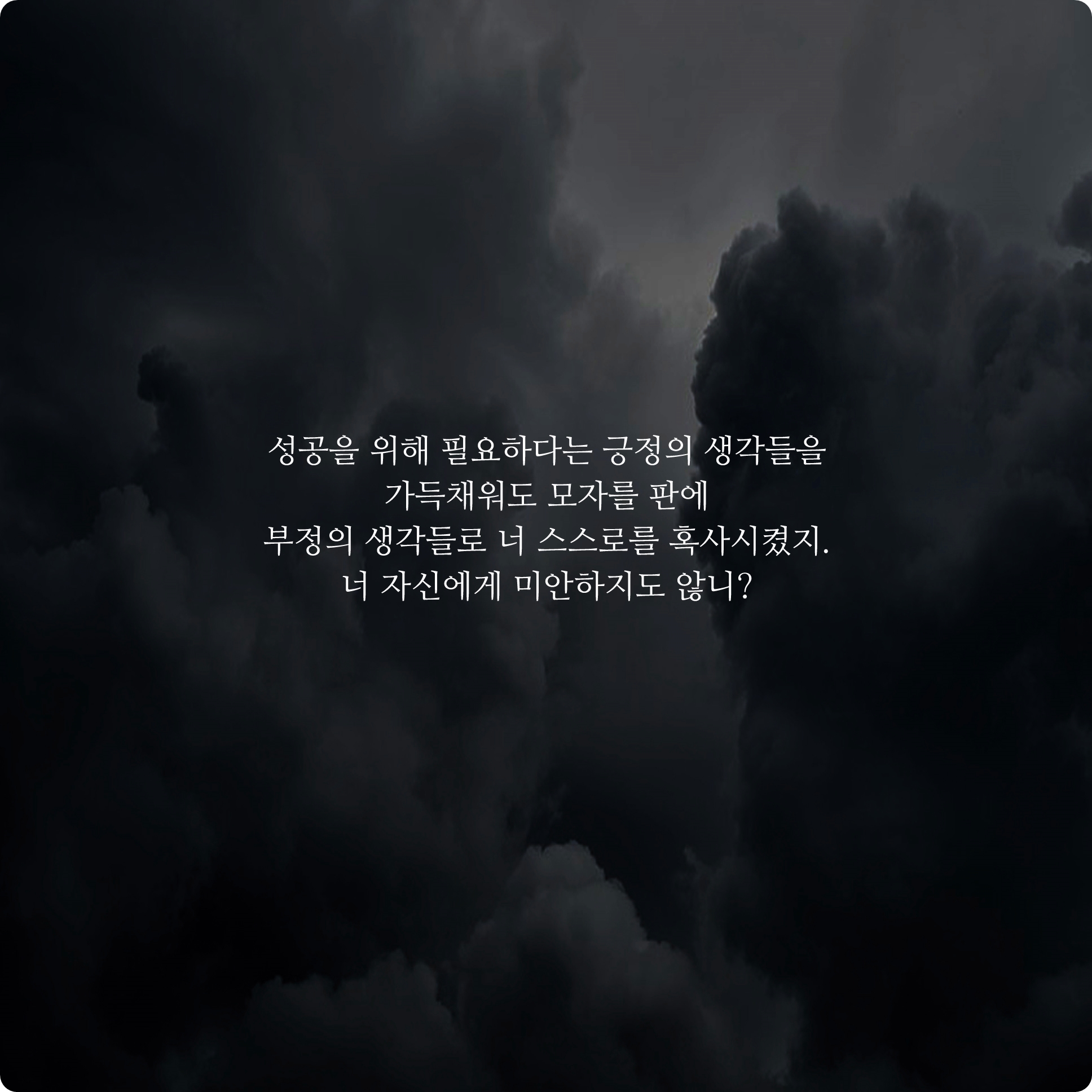 성공을 위해 필요하다는 긍정의 생각들을 가득채워도 모자를 판에 부정의 생각들로 너 스스로를 혹사시켰지. 너 자신에게 미안하지도 않니?