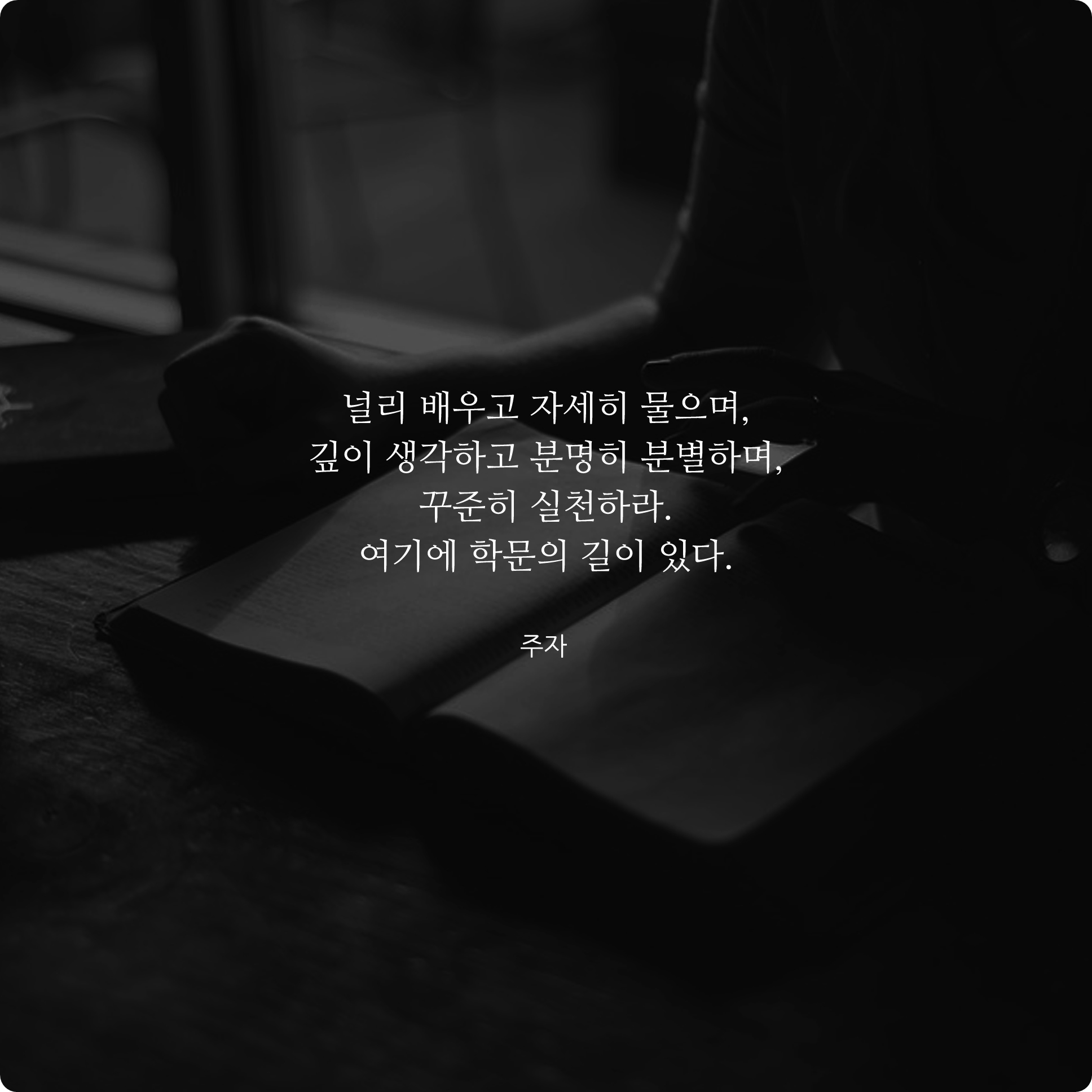 널리 배우고 자세히 물으며, 깊이 생각하고 분명히 분별하며, 꾸준히 실천하라. 여기에 학문의 길이 있다.