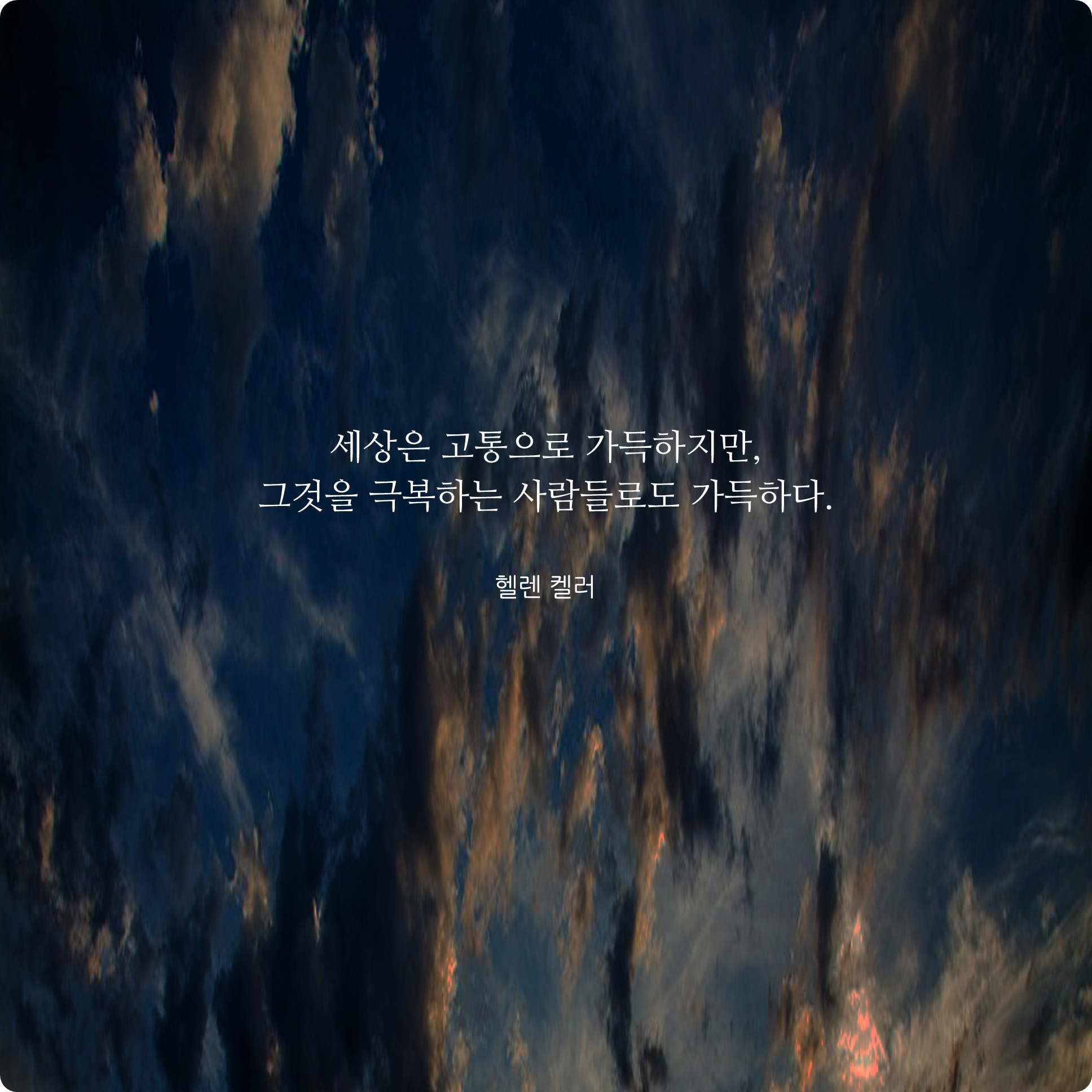 참으로 세상에는 수많은 오려움과 고통들로 가득해요. 어쩌면 인생의 시간은 힘든 시간들의 연속입니다. 하지만 그런 어려운 시기들을 긍정적으로 생각한다면 쉽게 헤쳐나갈 수 있습니다. 분명한 것은 힘들고 어려운 시기도 많지만 반대로 생각하면 그만큼 행복하고 좋은 일들의 연속인 것이 우리의 인생이 아닐까요? 행복과 불행은 바라보는 작은 관점의 차이일 뿐이죠.