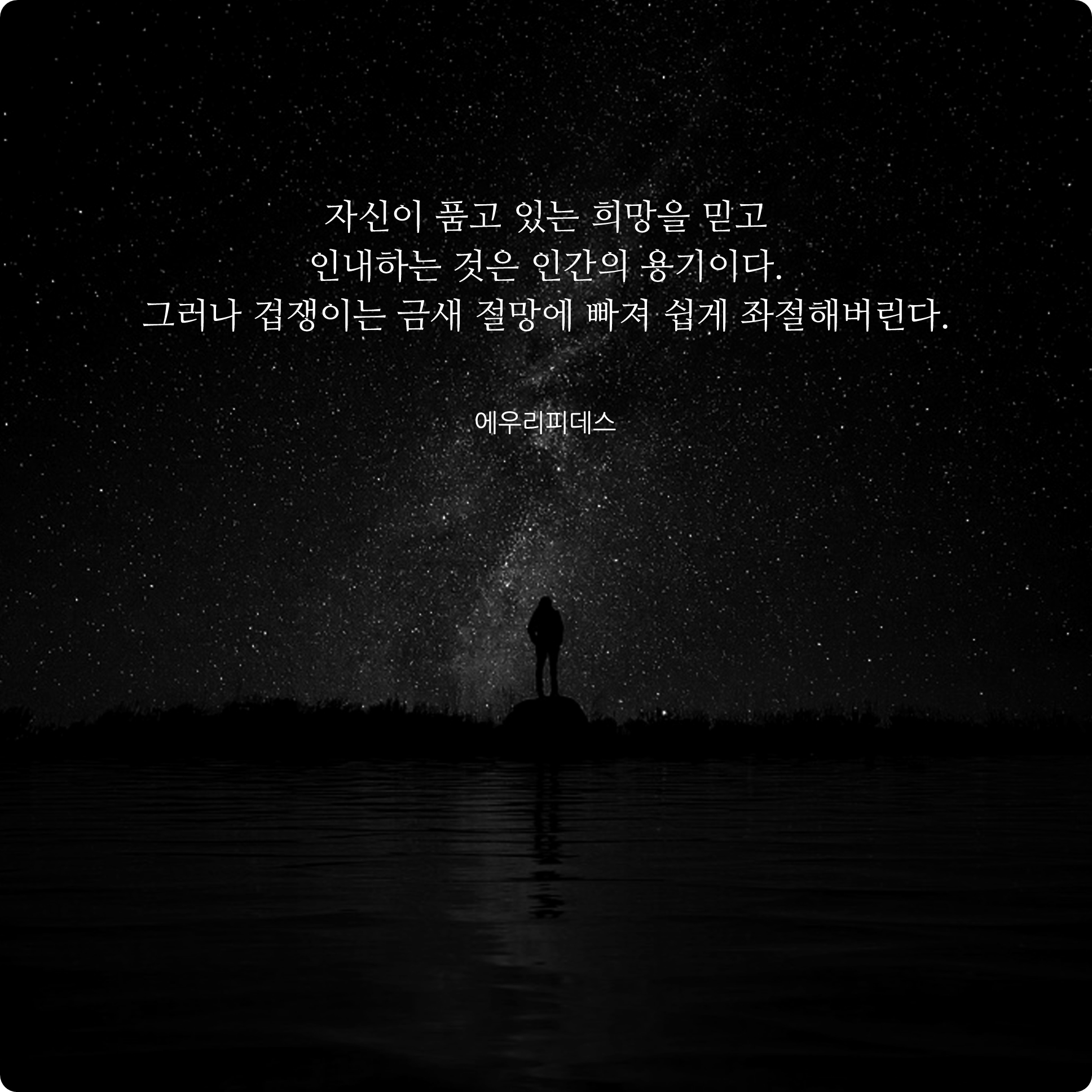 희망을 간직하며 앞으로 꾸준하게 나아갈 수 있는 것은 인간의 숙명입니다. 어쩌면 인간 사회에서의 문화, 기술, 과학 모든 것들은 끊임없는 용기와 도전 수많은 시도를 통해서 이룩해낸 것들이 아닐까요? 그런 과정에서 쉽게 절망에 빠지는 것은 포기가 되며 '실패'로 정의할 수 있습니다. 하지만 실패도 다시 한 번 재도전을 통해 나아가는 과정이 된다면 결국엔 그것은 또 한번의 성공을 위해 필요한 '과정'이 되는 것이죠.