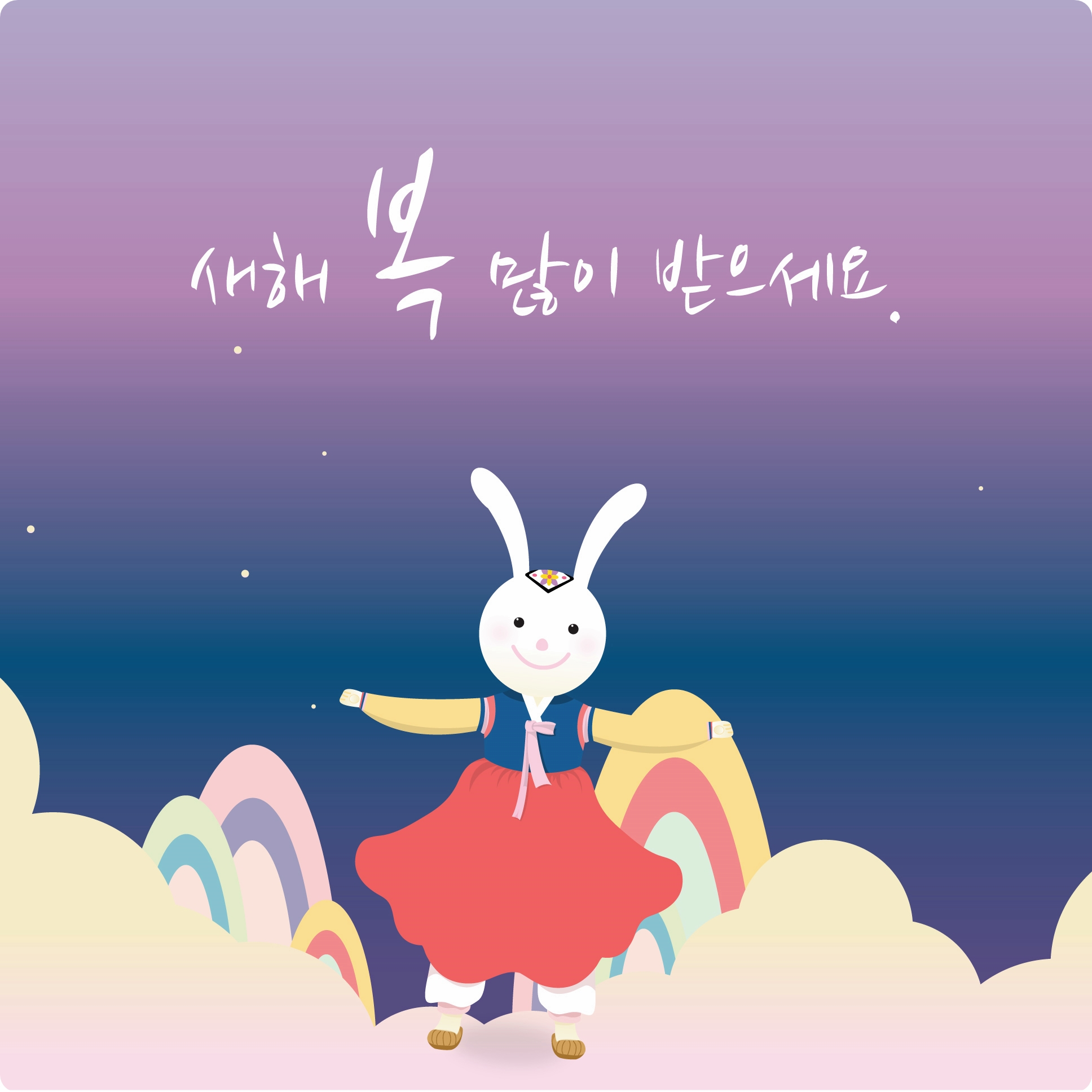 깔끔하게 표현이 된 토끼 캐릭터가 밝게 인사하고 있는 신년인사 이미지입니다. 한복을 입고 환하게 웃고 있는 모습이 귀엽네요.