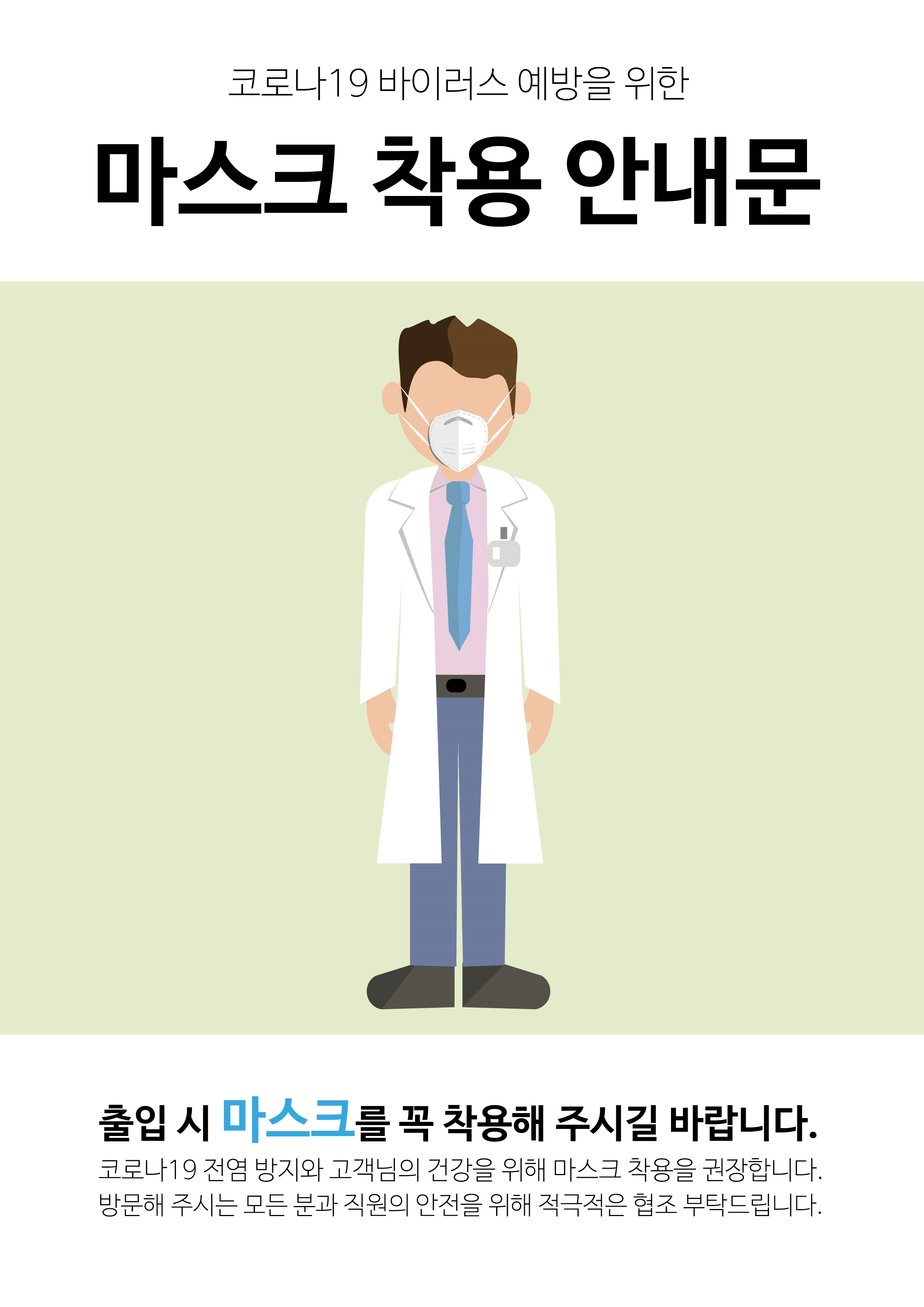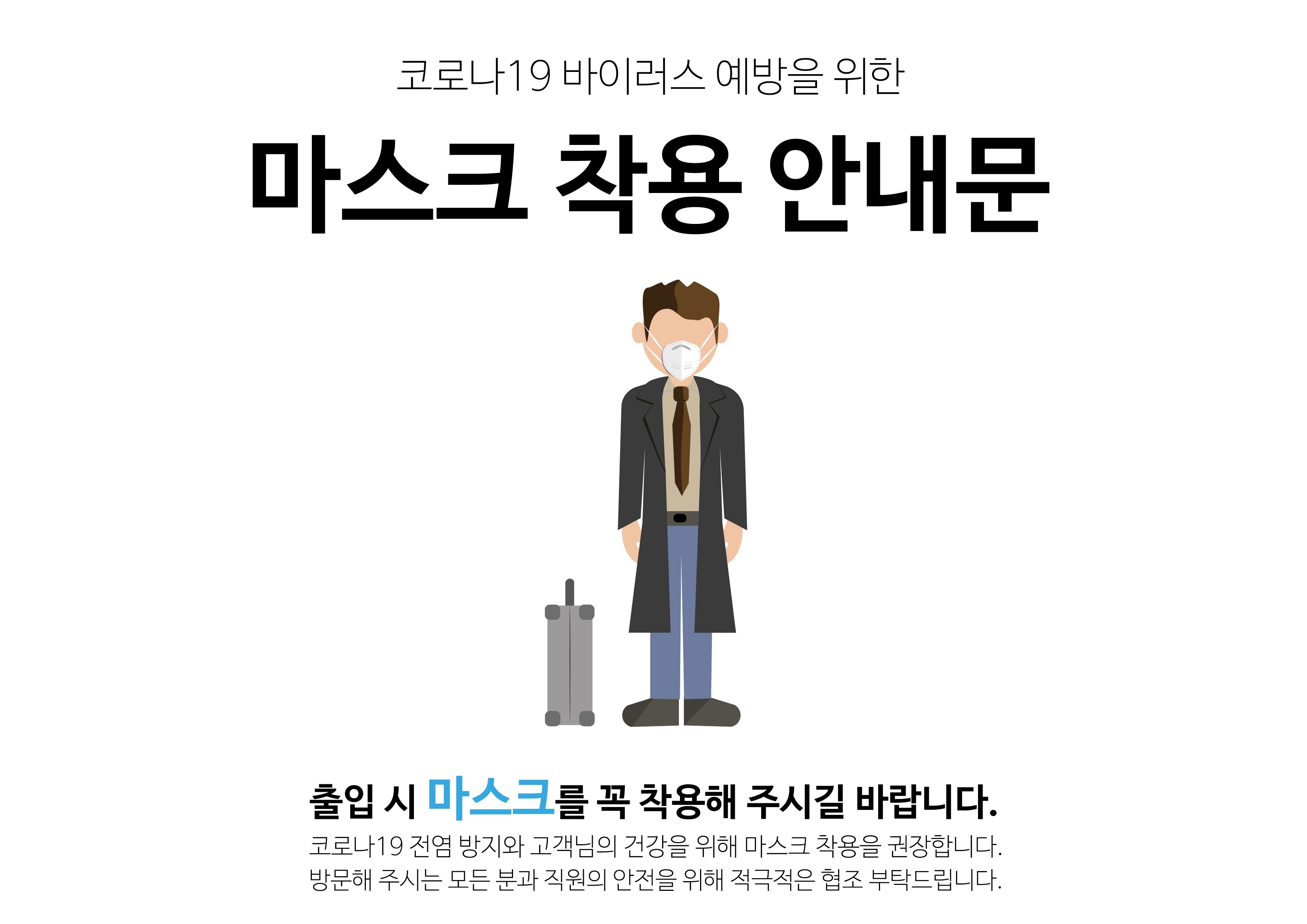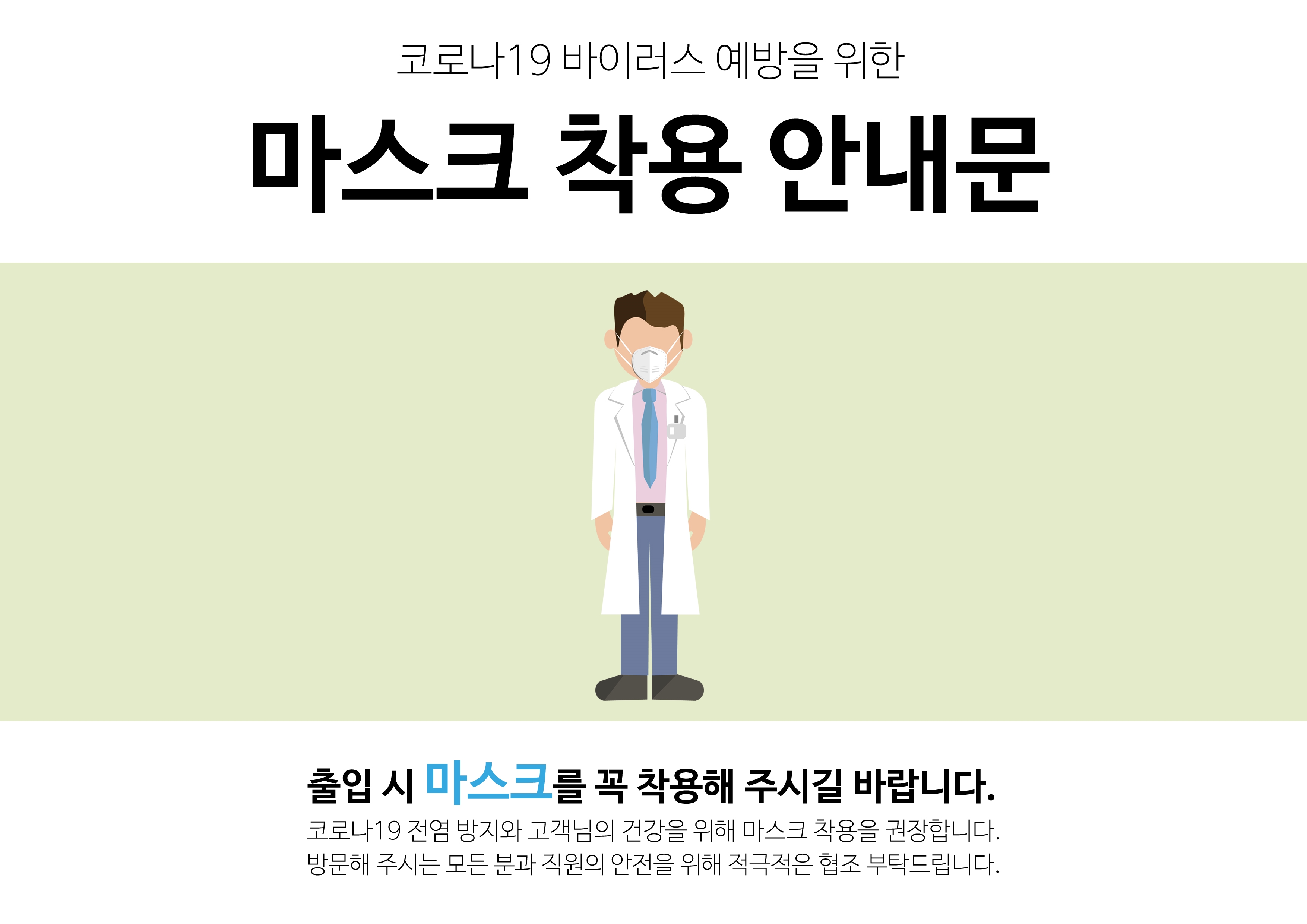 각각 마스크를 쓴 사람이 총 3명의 다양한 느낌으로 표현되었으며, 출입 시 마스크를 꼭 착용해 주시길 바란다는 내용이 들어가 있는 안내문입니다. 너무 길어진 스크롤을 줄이기 위해서 연달아서 세 개를 올렸기 때문에 글씨가 작게 보이지만 아래쪽에 옅은 회색으로 된 내용은 '코로나19 전염 방지와 고객님의 건강을 위해 마스크 착용을 권장합니다. 방문해 주시는 모든 분과 직원의 안전을 위해 적극적인 협조 부탁드립니다.'라고 적혀 있습니다.
