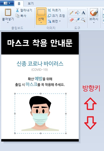 혹시라도 하단에 단체 명칭이나 매장의 상호나 이름, 로고를 넣고자 하시는 분들은 모든 컴퓨터에 깔려있는 그림판으로 쉽게 넣을 수 있지 않을까 싶은데요. 그러기 위해서는 각각의 포스터 이미지를 조금씩 위로 올려서 여백의 공간을 만든 다음 그 여백에 상호나 이름을 넣으면 되는데요. 우선 그림판을 켜신 다음에 해당 안내문 이미지를 그림판으로 끌어서 드래그를 하신 다음에 첫 번째처럼 점선으로 되어 있는 도구 표시가 있습니다. 그것을 누른 뒤 두 번째처럼 위치를 변경할 이미지를 드래그하신 다음 키보드에 있는 방향 키(위 또는 아래)를 누르시면 위치가 위 아래로 변경이 됩니다. 마찬가지로 다른 문구들도 조금씩 위로 올린 다음에 여백의 공간을 만든 후 세 번째처럼 텍스트를 입력할 수 있는 도구를 누른 뒤 원하는 위치에 클릭한 다음 단체나 이름이나 단체 명을 넣으면 될 것 같습니다.